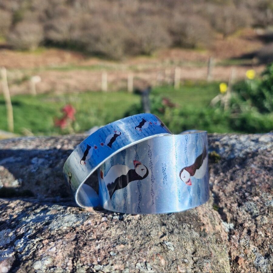 This gorgeous cuff bracelet features "Tammie Norrie" artwork by Hannah MacIver. It is made from aluminium. Hannah prints and makes the artwork transfers then slides them onto the aluminium she has previously bent into the cuff shape. Once dried she sands the edges and seals them with a coat of UV resin. As these are handmade the finish for each will be slightly differently. Available as narrow or wide cuff, select your preference using the drop down menu.