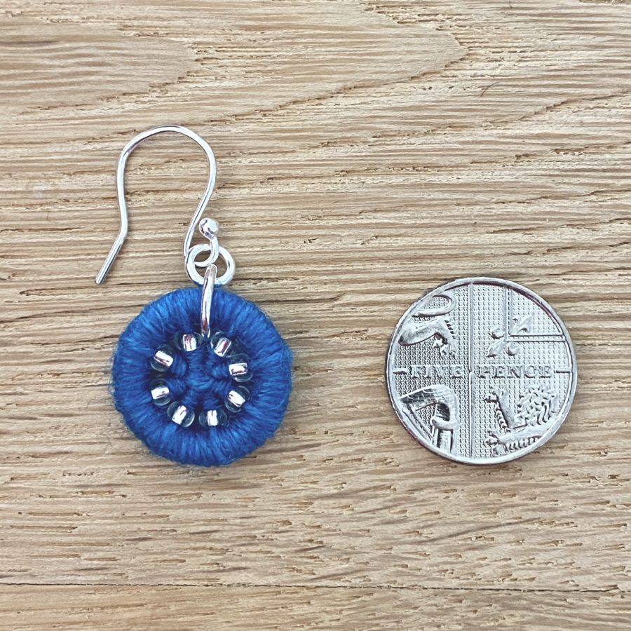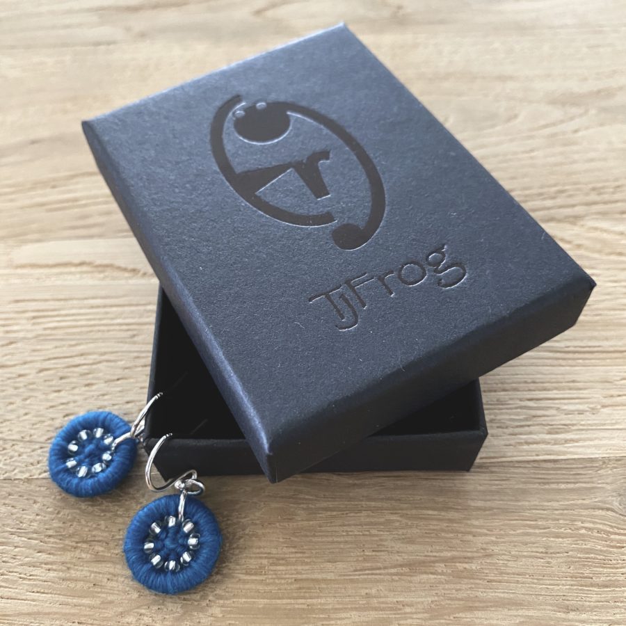 Beautiful earrings made using techniques of the heritage craft of Dorset Buttons. Yarn hand dyed in the Scottish Highlands combined with clear beads and finished off with sterling silver findings. All wrapped up in a TJFrog gift box made from recycled card and paper.