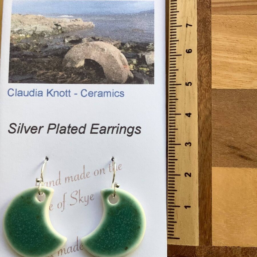 A pair of crescent ceramic earrings with silver plated ear hooks. The earrings are made of white stoneware clay with a Tourmaline glaze. These earrings are individually handcrafted with slight variations of glaze, pattern and design.