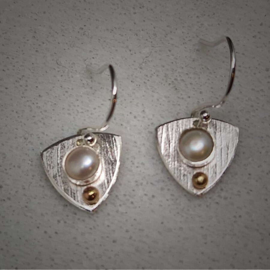 A beautiful pair of earrings featuring a pearl set in textured silver with a golden ball. All items are gift boxed with recyclable packaging.