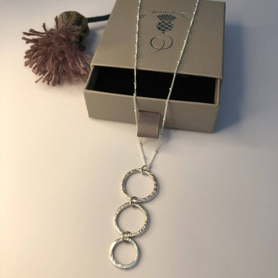 This beautiful necklace is hand made and designed by Lorraine of Twisted Thistles. The piece consists of a trio of hammered silver rings attached by silver jump rings on a beaded chain.
