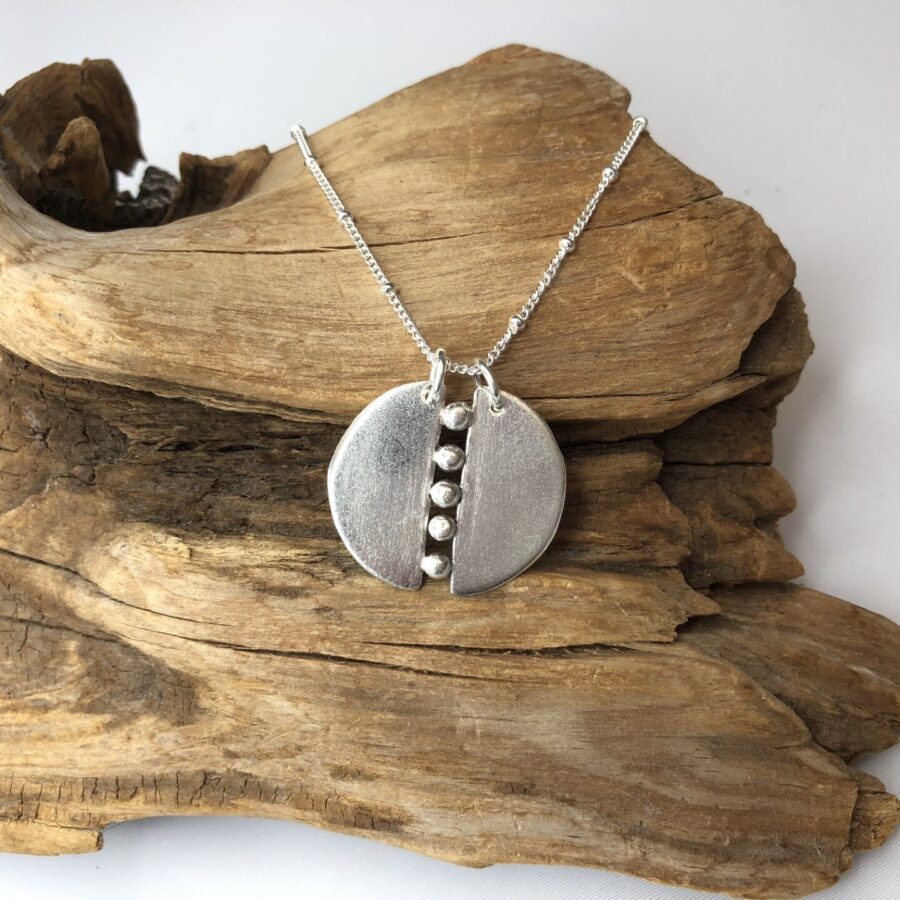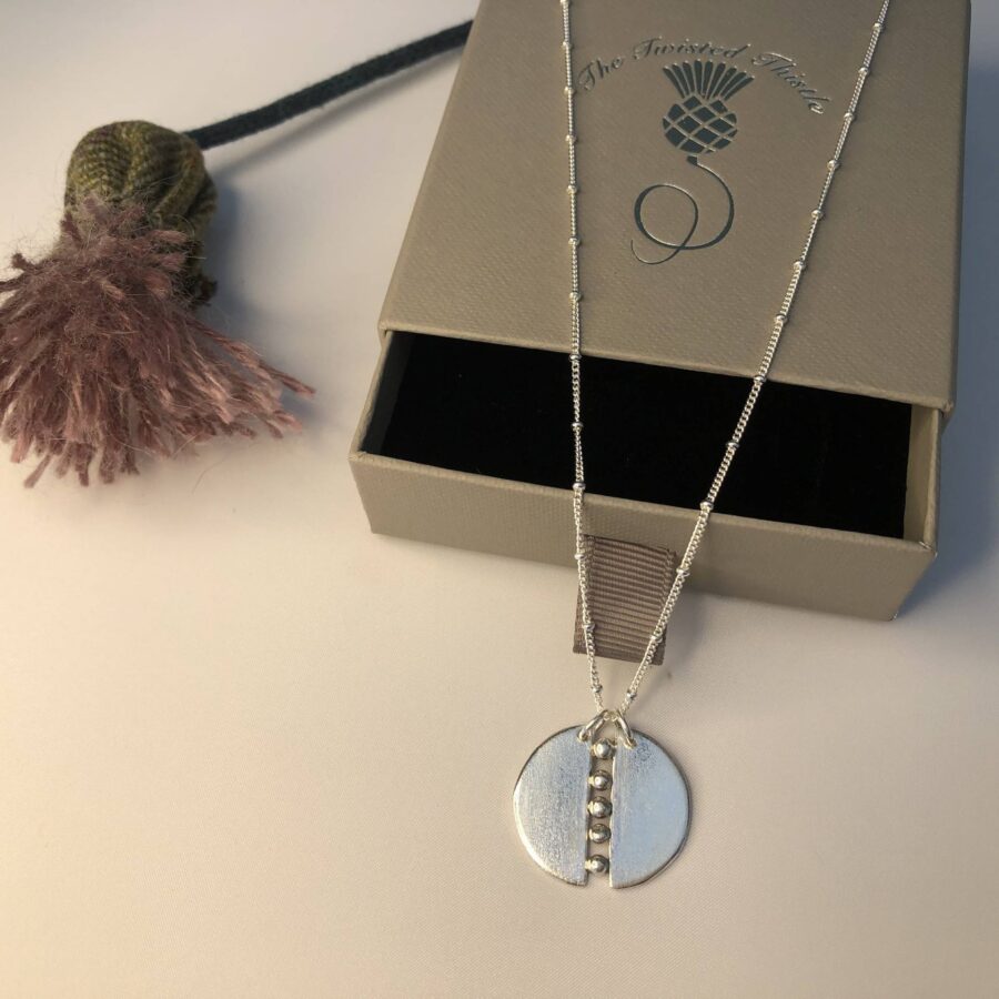 This beautiful necklace is hand made and designed by Lorraine of Twisted Thistles. The piece consists of two brushed semicircles joined by silver balls on a beaded chain.
