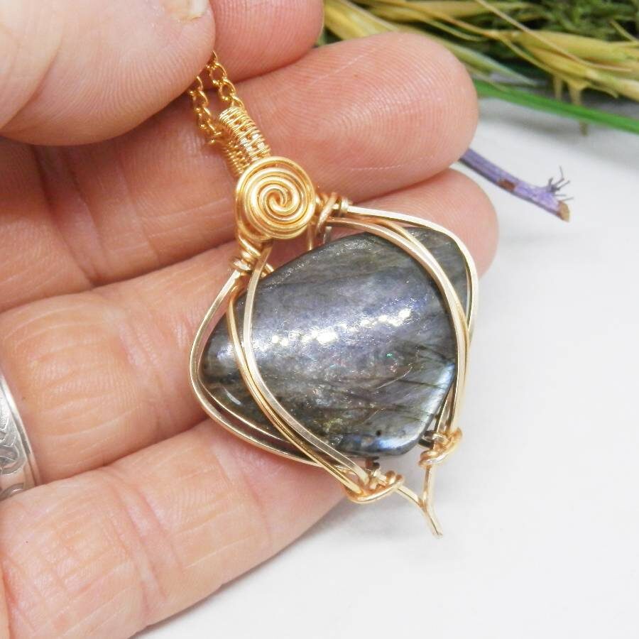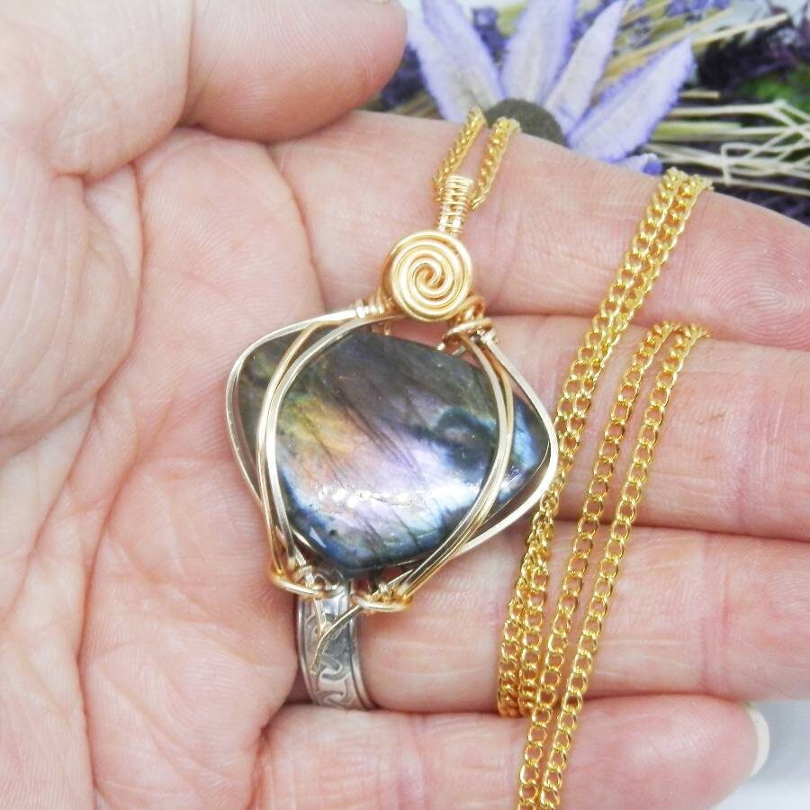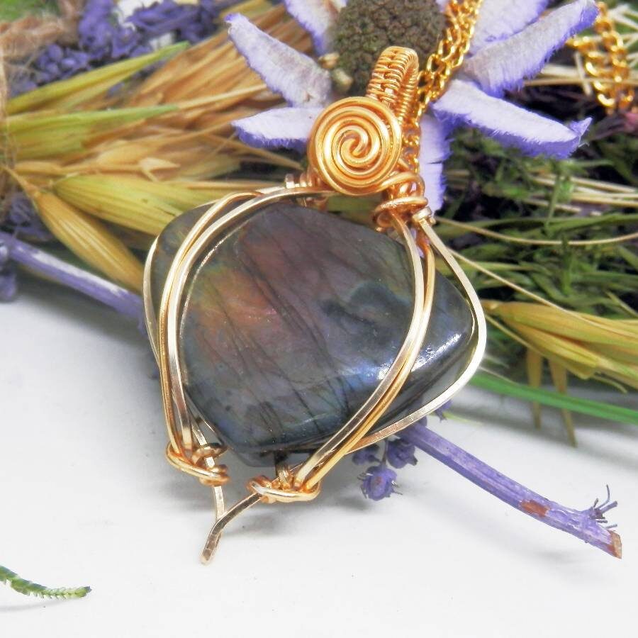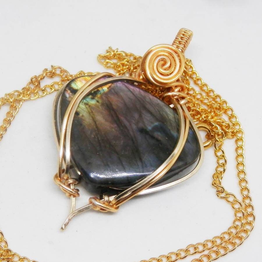 This is a gorgeous Celtic style wire wrapped necklace, made with gold vermeil and gold plated wire, wrapped around a beautiful flashy labradorite cabochon. The pendant is approx 5 cm long by 3.2 cm wide and 1.2 cm thick at the deepest point. Comes with a 24 inch gold plated chain. Lead and nickel free. This wire wrapped pendant will come to you placed in a soft velvet pouch.