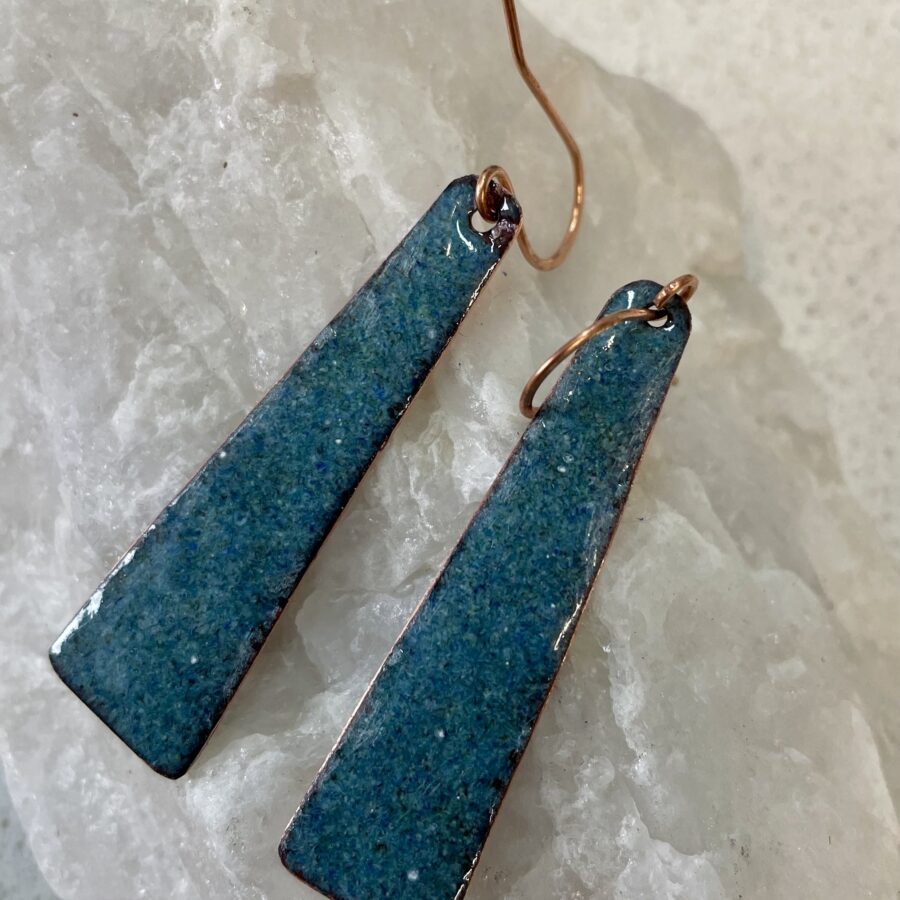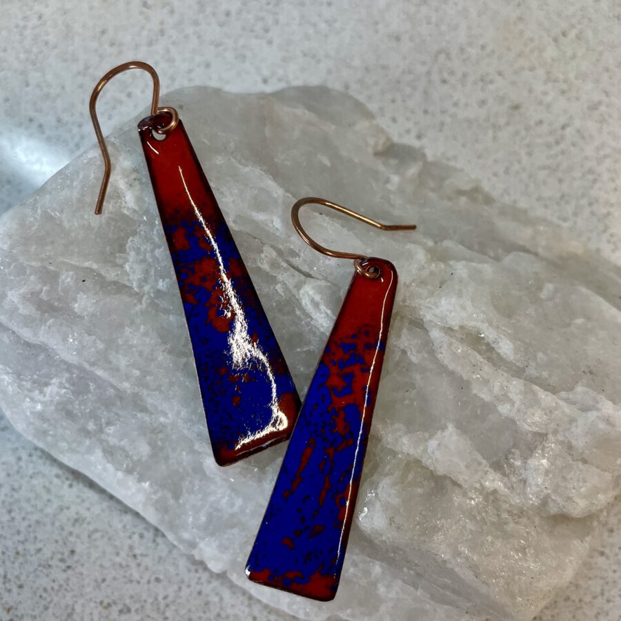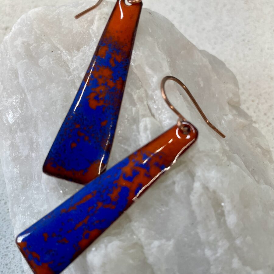 A pretty pair of enamelled copper earrings with copper ear wires. Counter enamelled on the back.