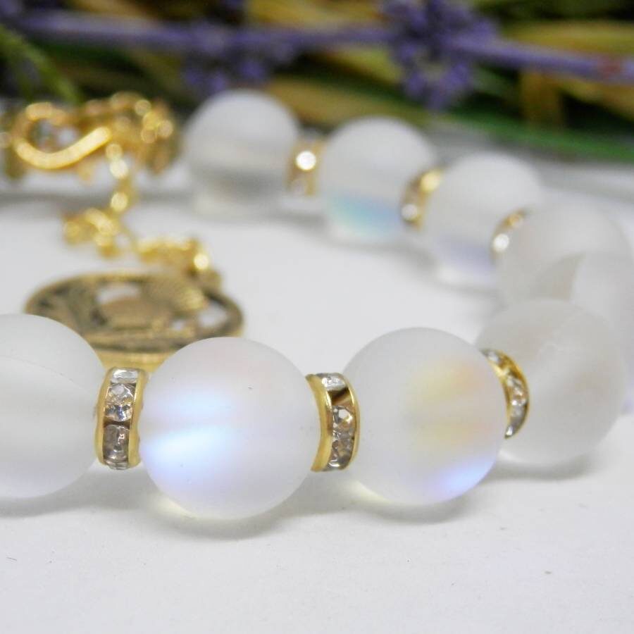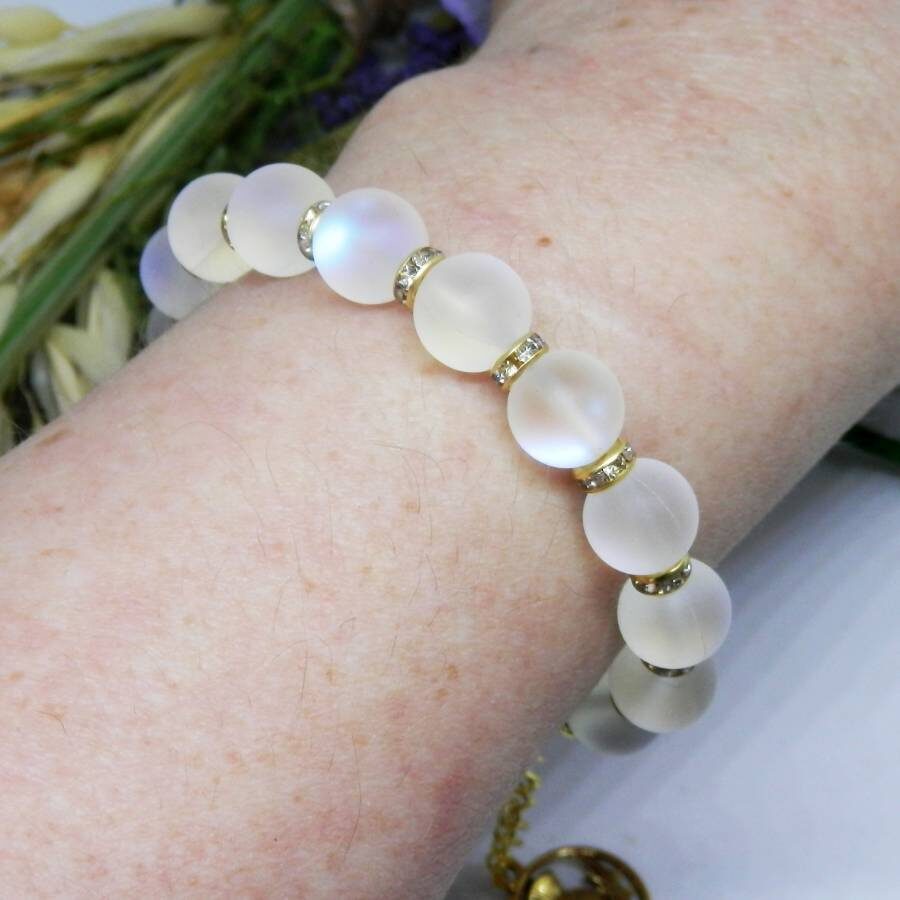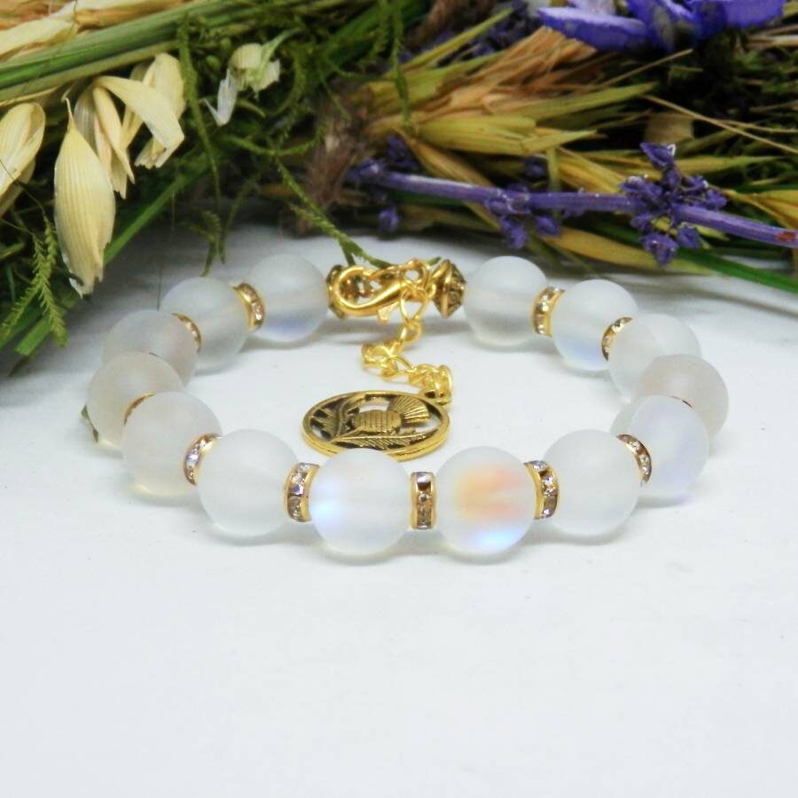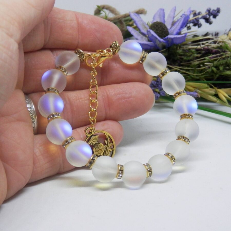 This gorgeous memory wire bracelet is made using gold plated memory wire, gold plated diamante spacers and a load of stunning white synthetic moonstone "Glow' beads! Comes with a gold coloured thistle charm. Nickle and Lead Free. Would fit up to a 7 inch wrist, with an extension chain for larger sizes. Comes to you wrapped in tissue, no plastic. Posted in repurposed envelopes or boxes as the maker is trying to do her tiny bit for the environment by reusing my postage wrappings.