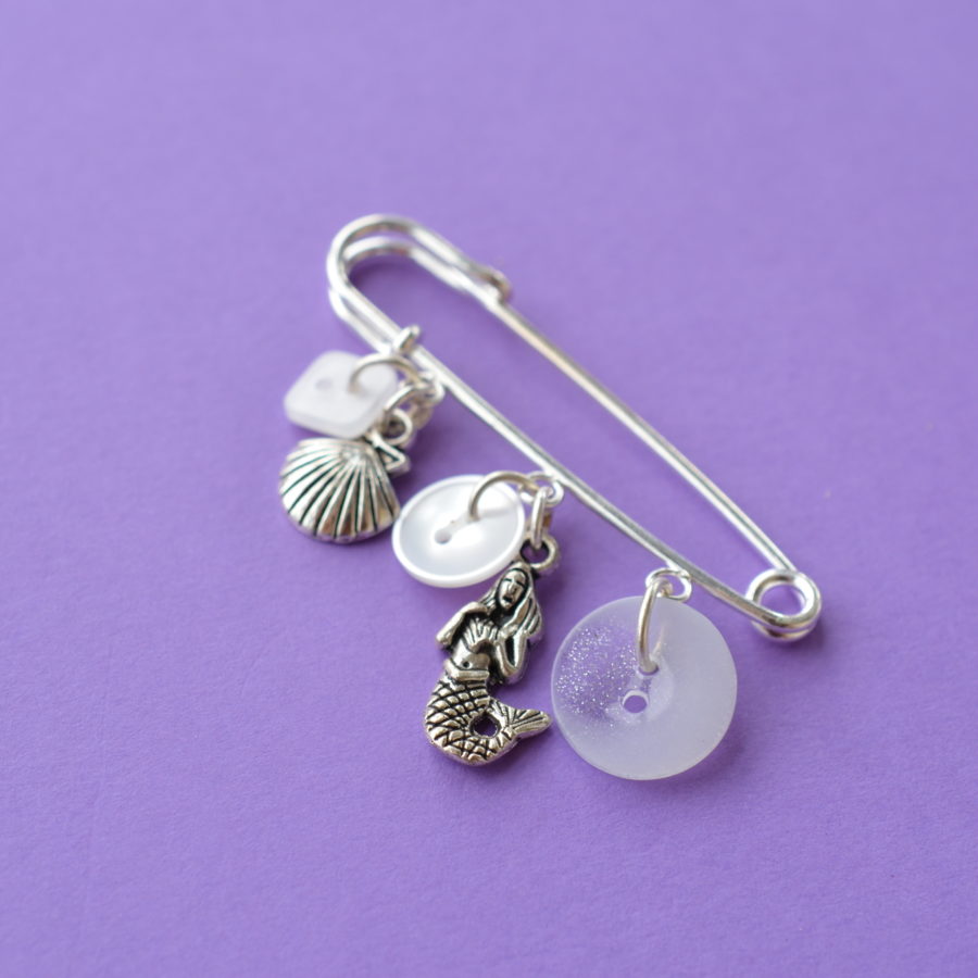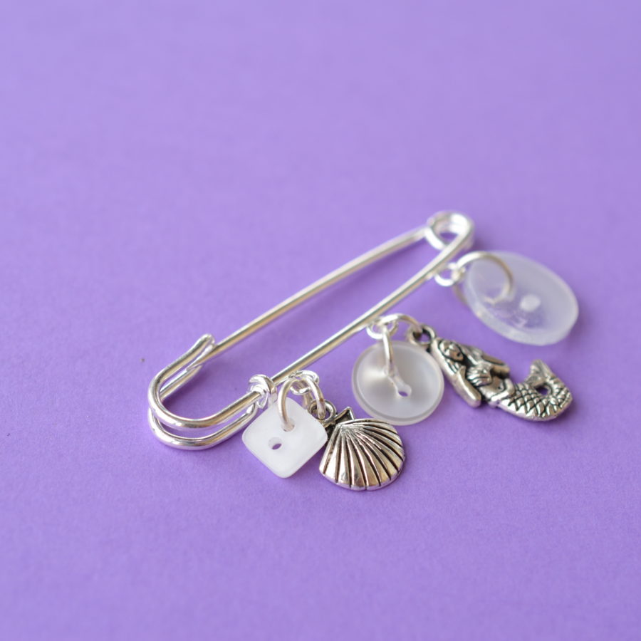 Two-inch silver-plated pin with white buttons and mermaid sea themed charms. This is lovely worn as a brooch, shawl pin, decorating a bag or hat or even just on your kilt. All the findings are silver plated and the brooch is supplied in gift pouch.