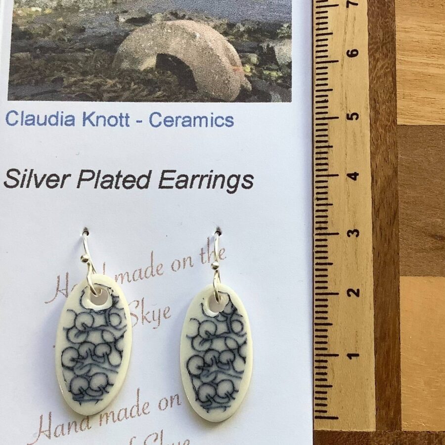 A pair of small oval ceramic earrings with silver plated ear hooks. The earrings are made of white stoneware clay with a hand-drawn ceramic transfer of blue and white Broadford Bay Willow Pattern. These earrings are individually handcrafted with slight variations of glaze, pattern and design.