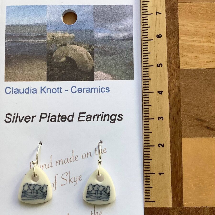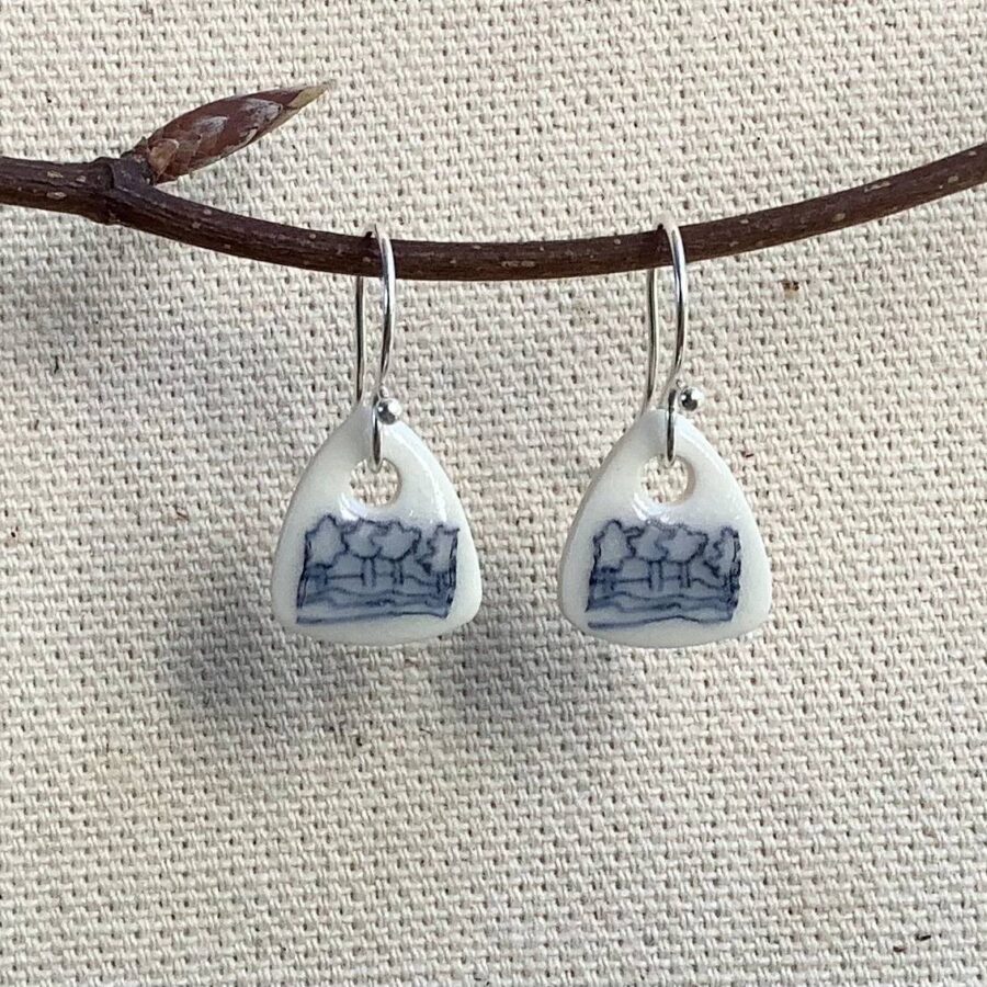 A pair of tiny triangular ceramic earrings with silver plated ear hooks. The earrings are made of white stoneware clay with a hand-drawn ceramic transfer of blue and white Broadford Bay Willow Pattern. These earrings are individually handcrafted with slight variations of glaze, pattern and design.
