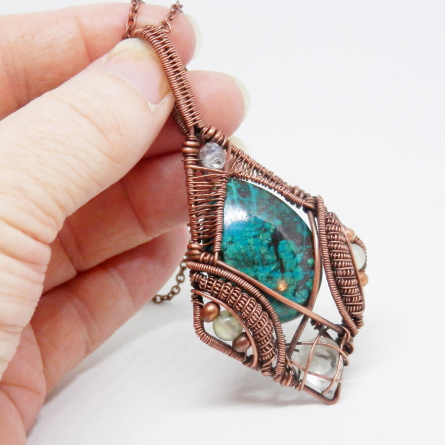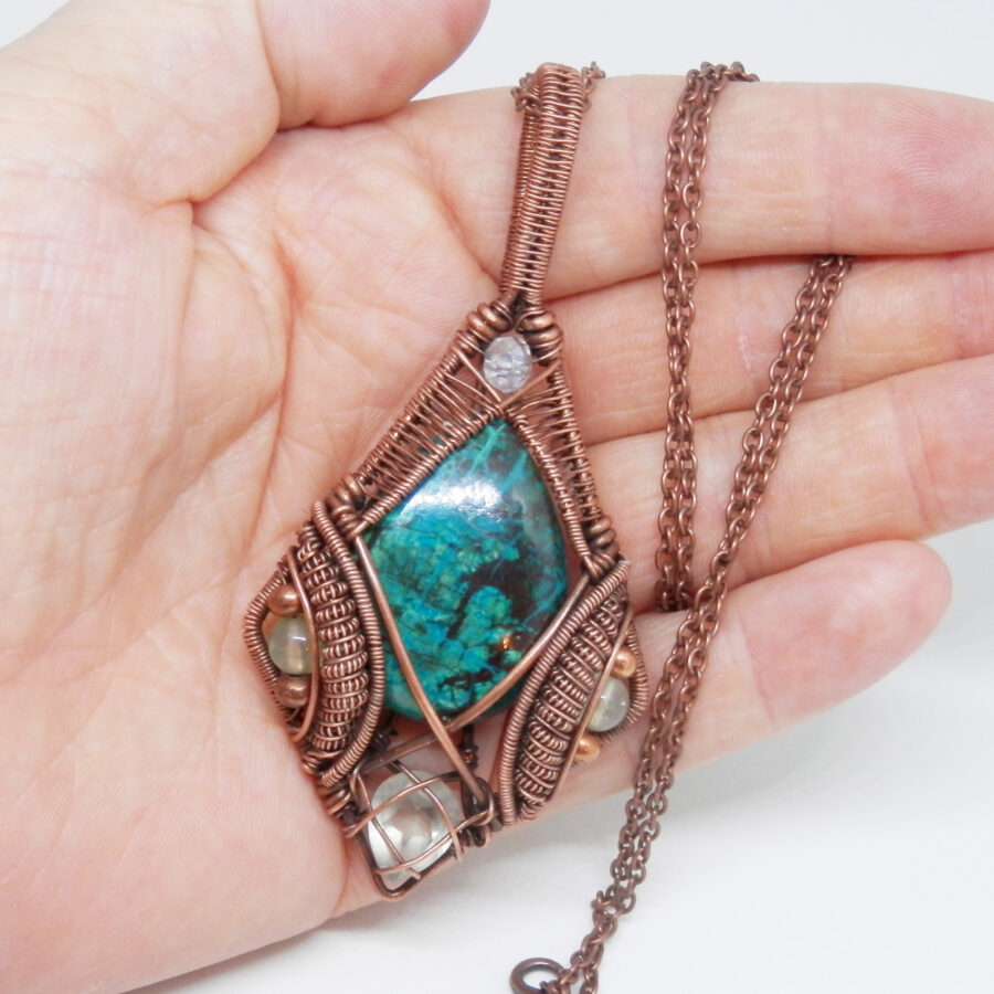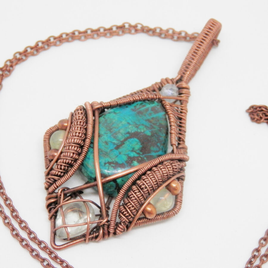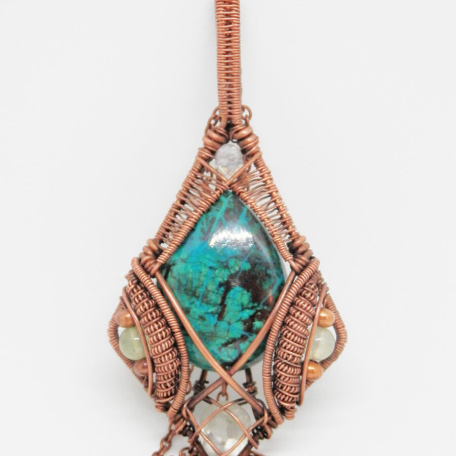 This is a gorgeous piece of teardrop shaped chrysocolla has been wrapped in antiqued copper wire in an Elvish style, with prehnite beads, a faceted glass bead, and a lovely faceted green amethyst at the bottom. The pendant is large at approximately 8.6 cm long by 4 cm wide and 1.2 cm thick at the deepest point on the bail. It comes with a 24 inch antiqued copper chain with lobster clasp. Lead and nickel free. This wire wrapped pendant will come to you placed in a soft velvet pouch.