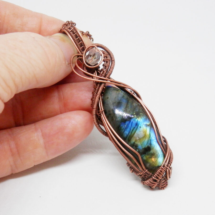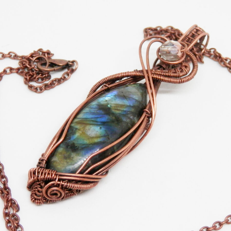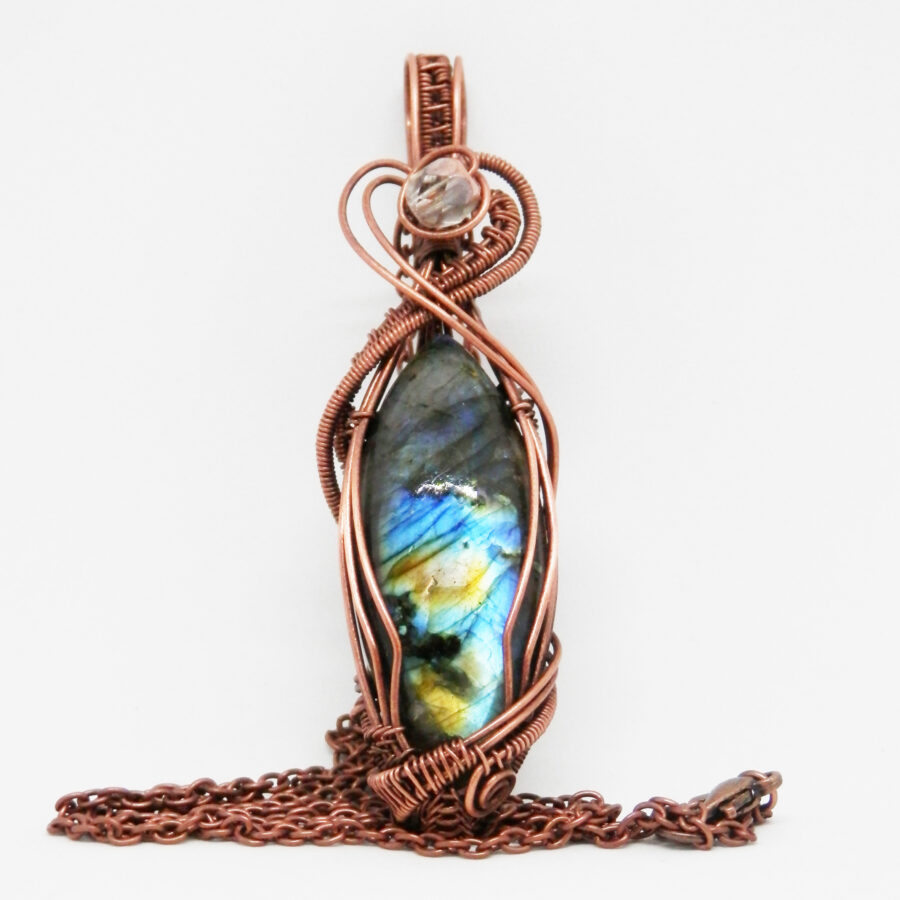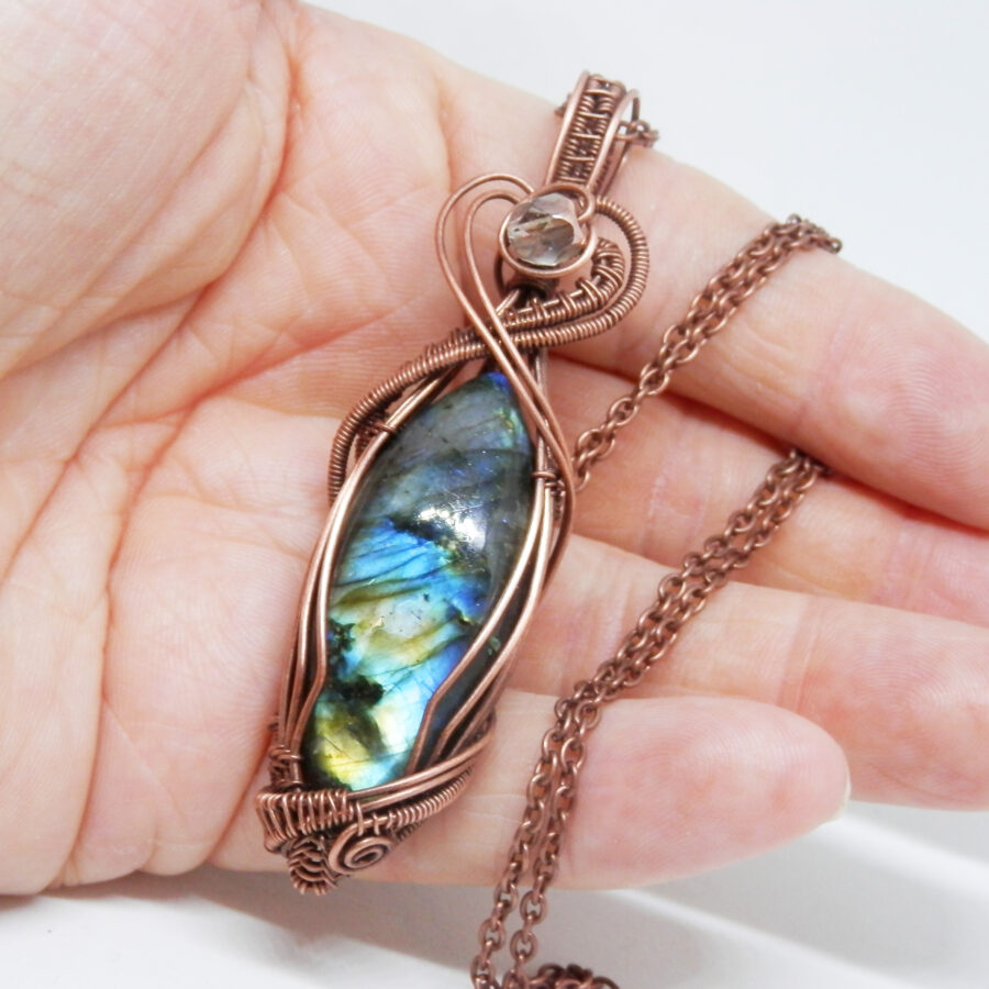 A very striking piece of flashy rainbow coloured labradorite in a marquise shape, wrapped in antiqued copper wire. The pendant is approximately 7.4 cm long by 2 cm wide and 1.5 cm thick at the deepest point. It comes with a 24 inch antiqued copper chain with lobster clasp. Lead and nickel free. This wire wrapped pendant will come to you placed in a soft velvet pouch.