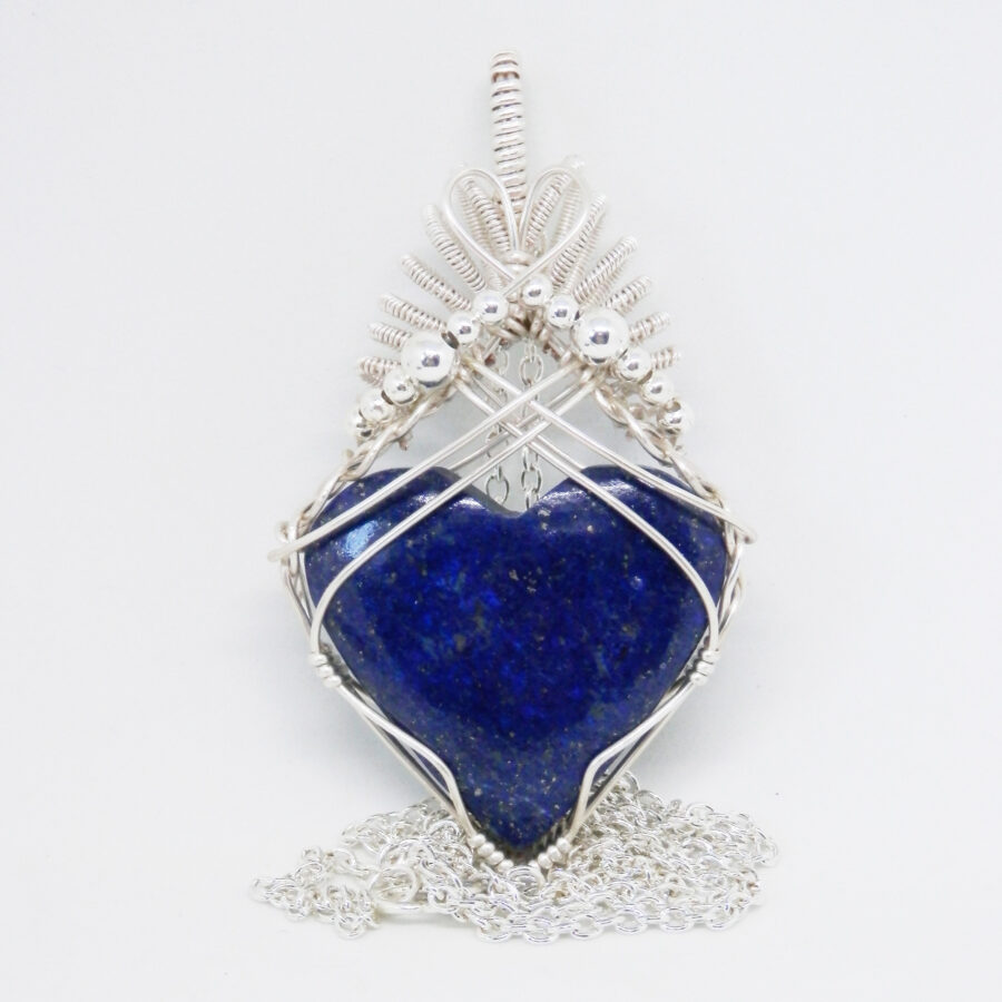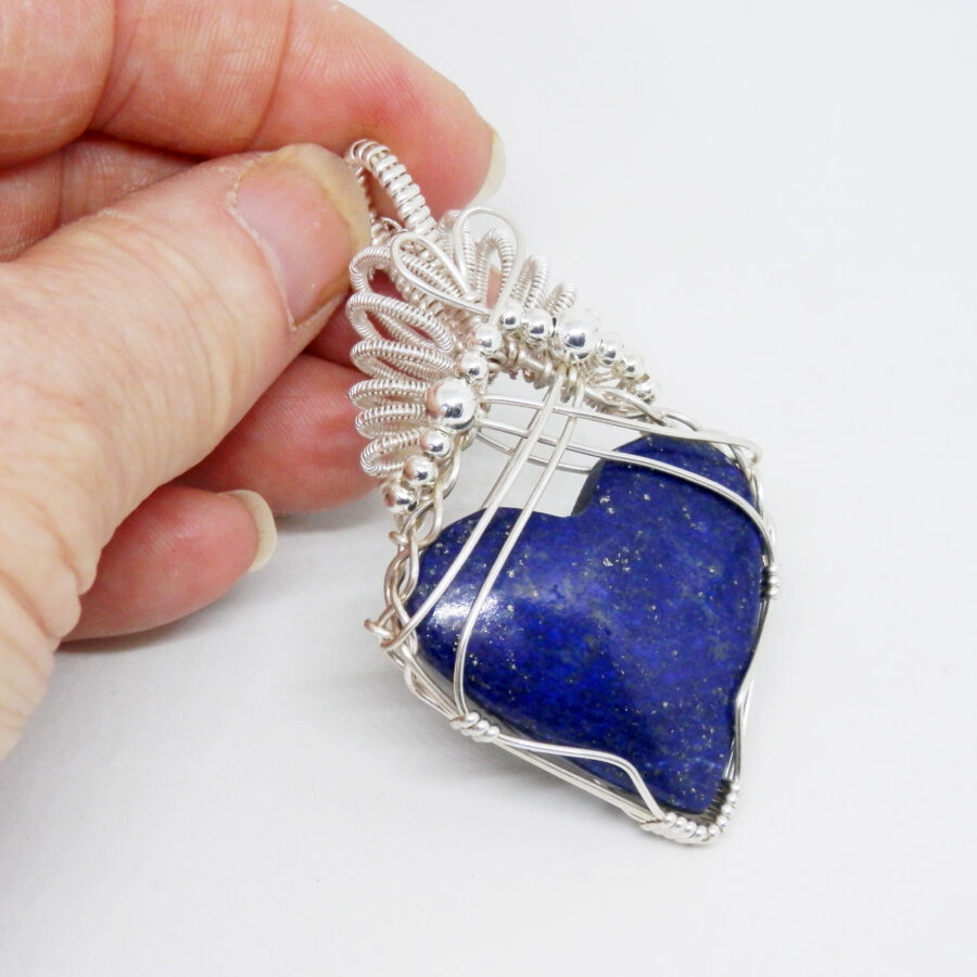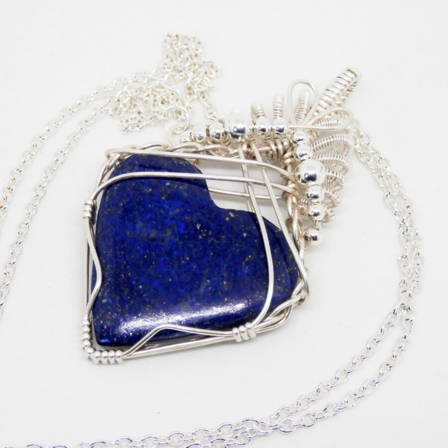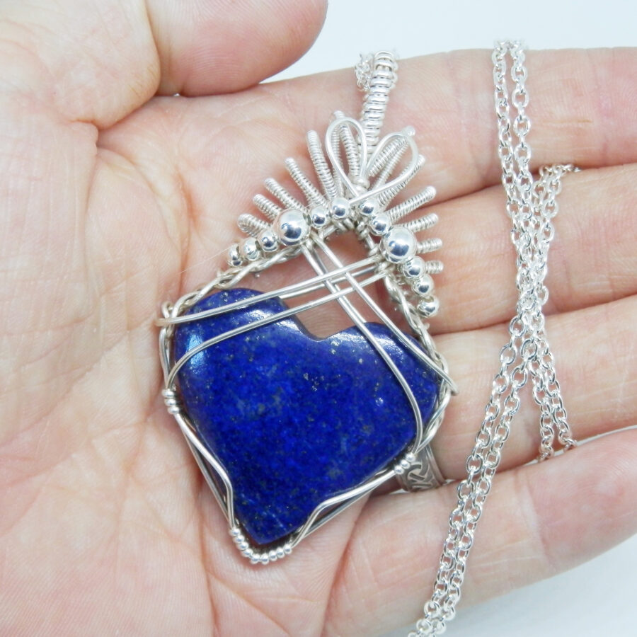A gorgeous wire wrapped necklace, made with silver plated copper wire, wrapped around a beautiful heart shaped lapis lazuli cabochon, with lots of swirls and silver plated beads. The pendant is around 7 cm long by 4 cm wide and 1.5 cm thick at the deepest point. It comes with a 24 inch silver plated chain with lobster clasp. Lead and nickel free. This wire wrapped pendant will come to you placed in a soft velvet pouch.