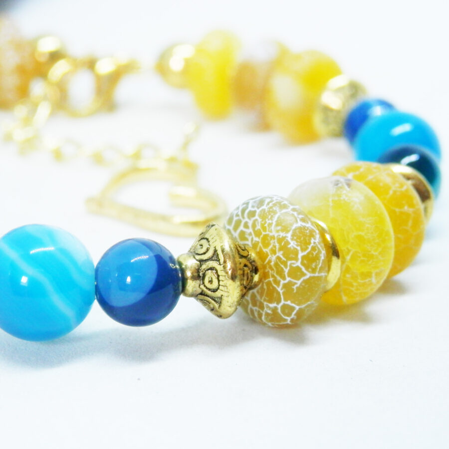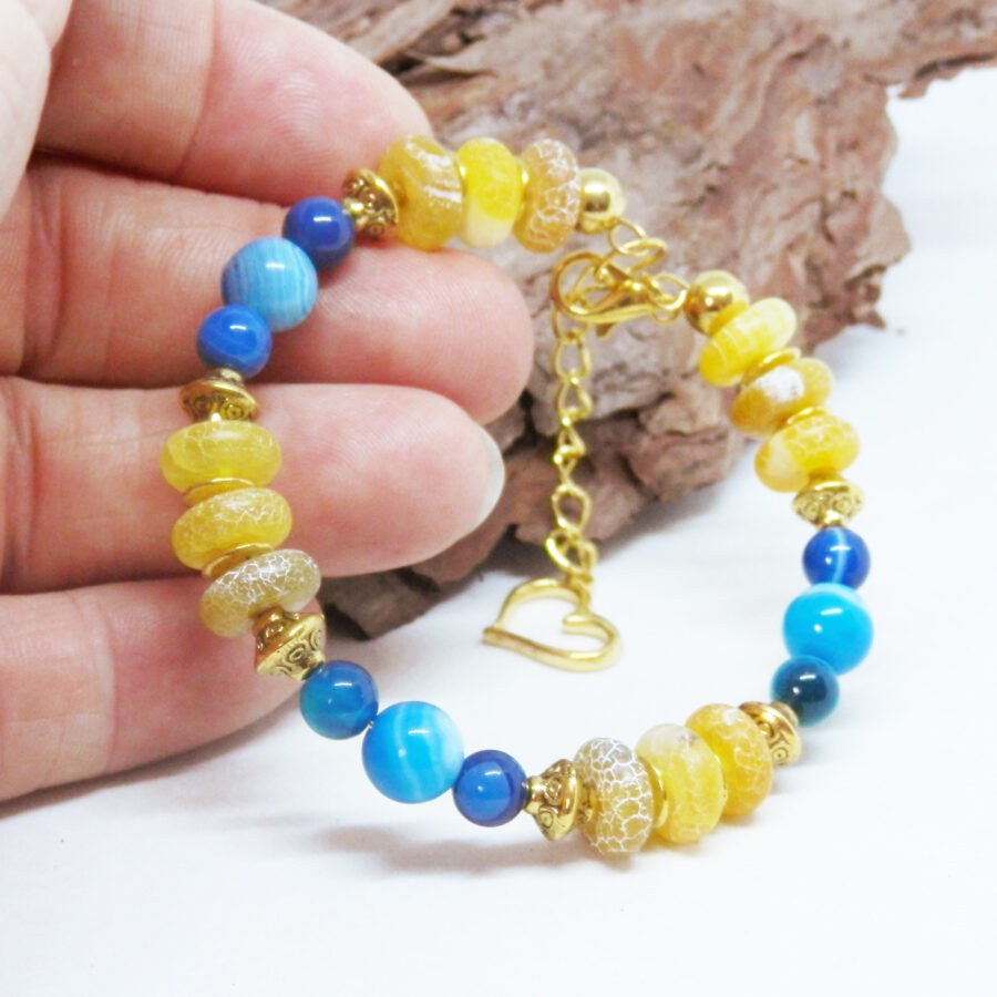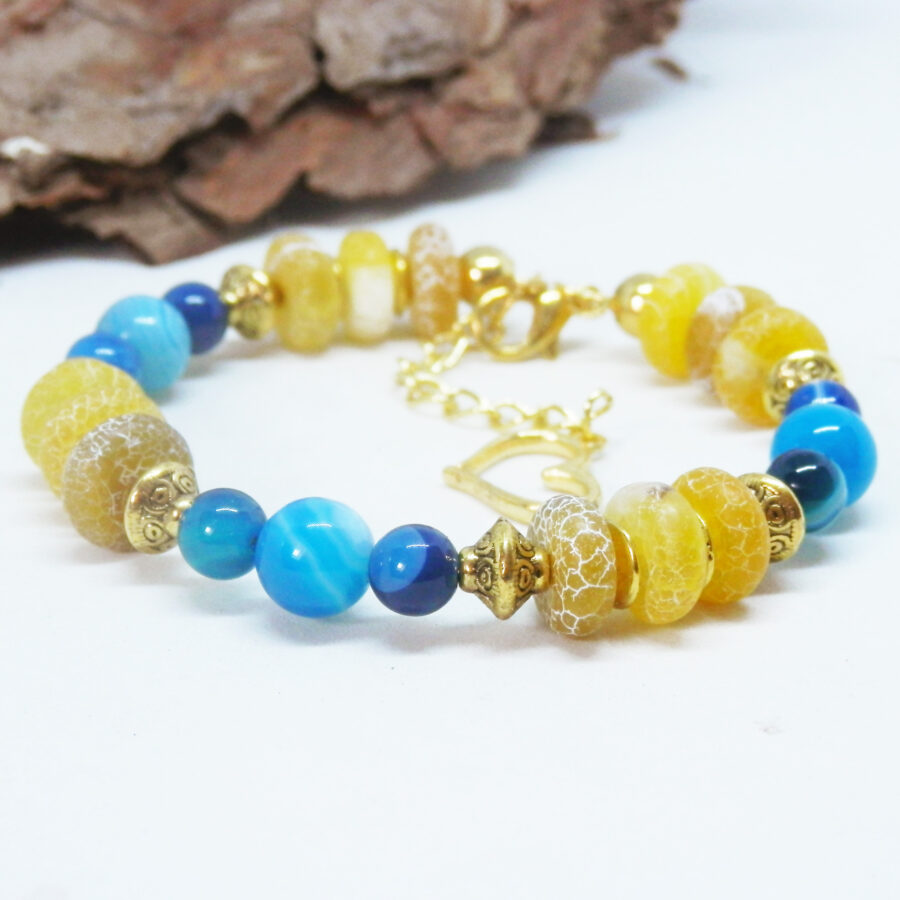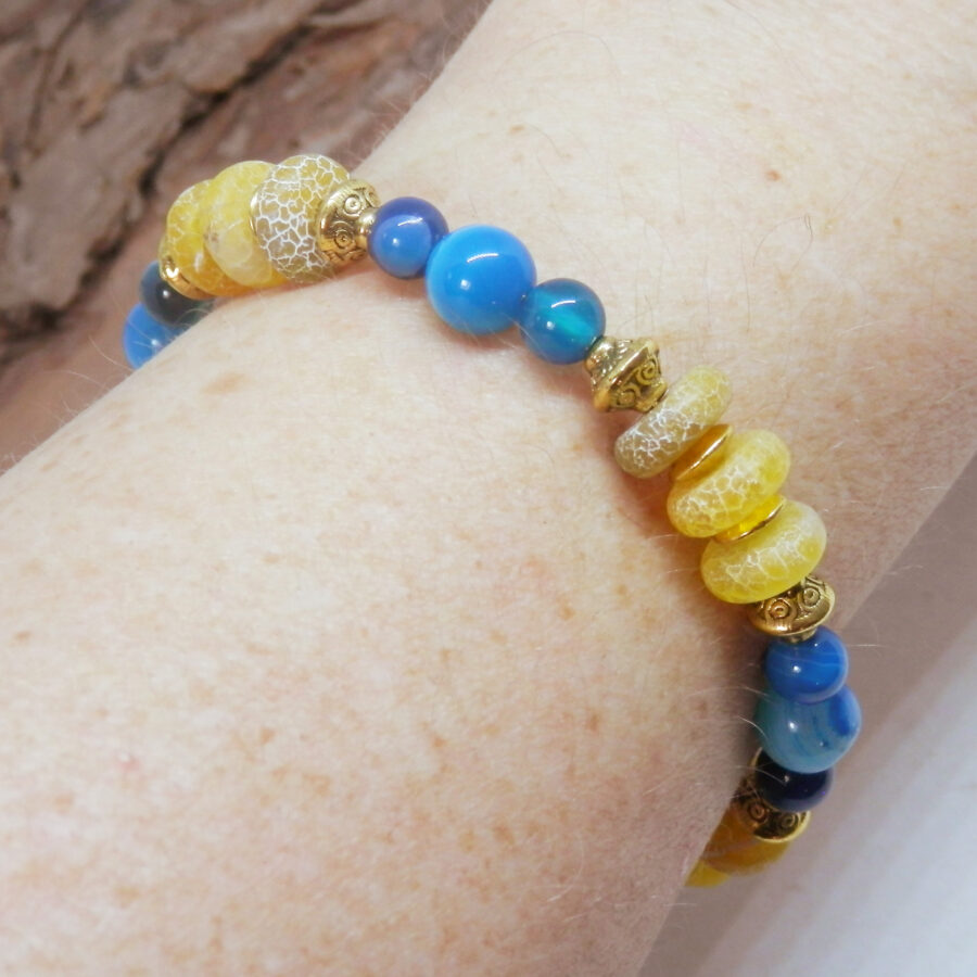 A beautiful memory wire bracelet made using gold plated wire, beads and clasp, with gorgeous yellow and blue agate beads, gold coloured spacers and Celtic patterned beads. Nickle and Lead Free. Would fit up to a 7 inch wrist, but has an extension chain for larger sized wrists. Comes to you wrapped in tissue, no plastic. Posted in repurposed envelopes or boxes.