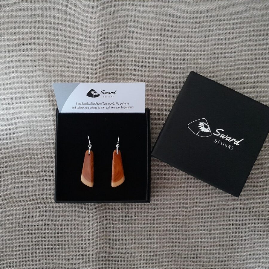 A unique pair of yew wood, asymmetric drop earrings with sterling silver findings.