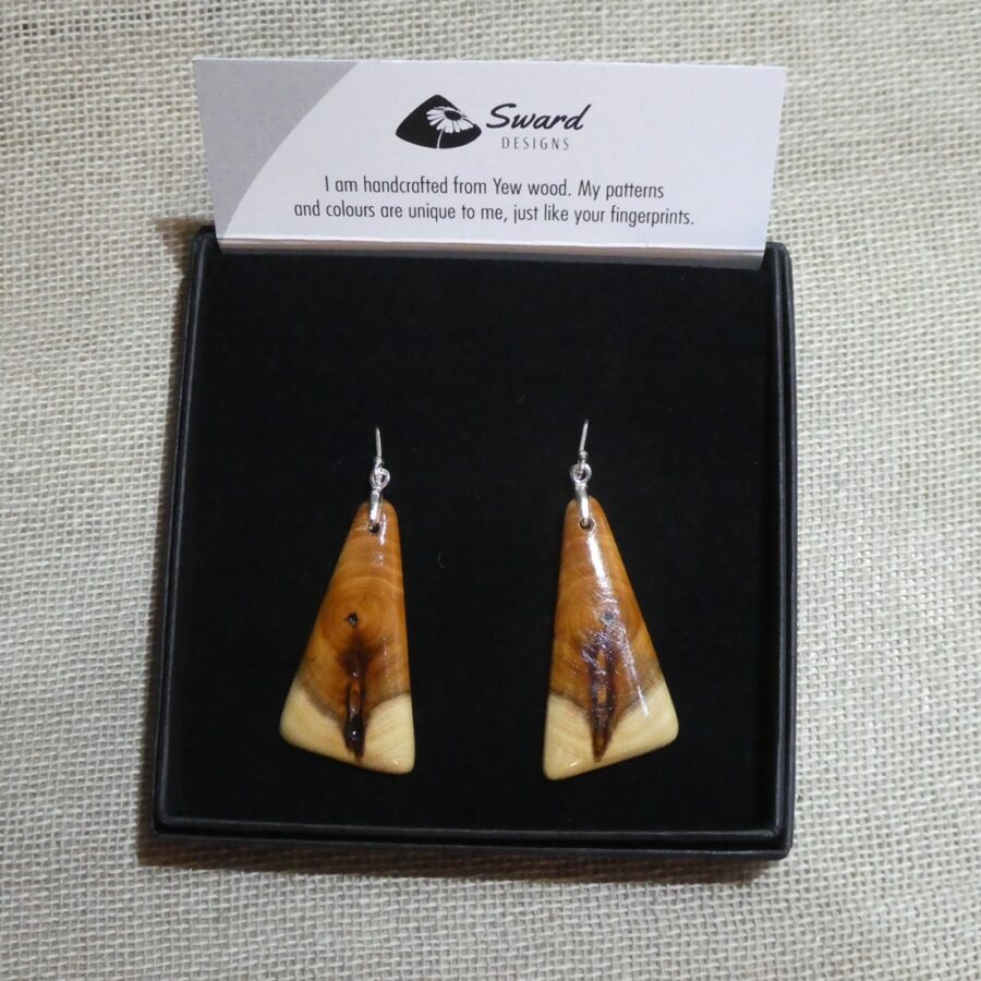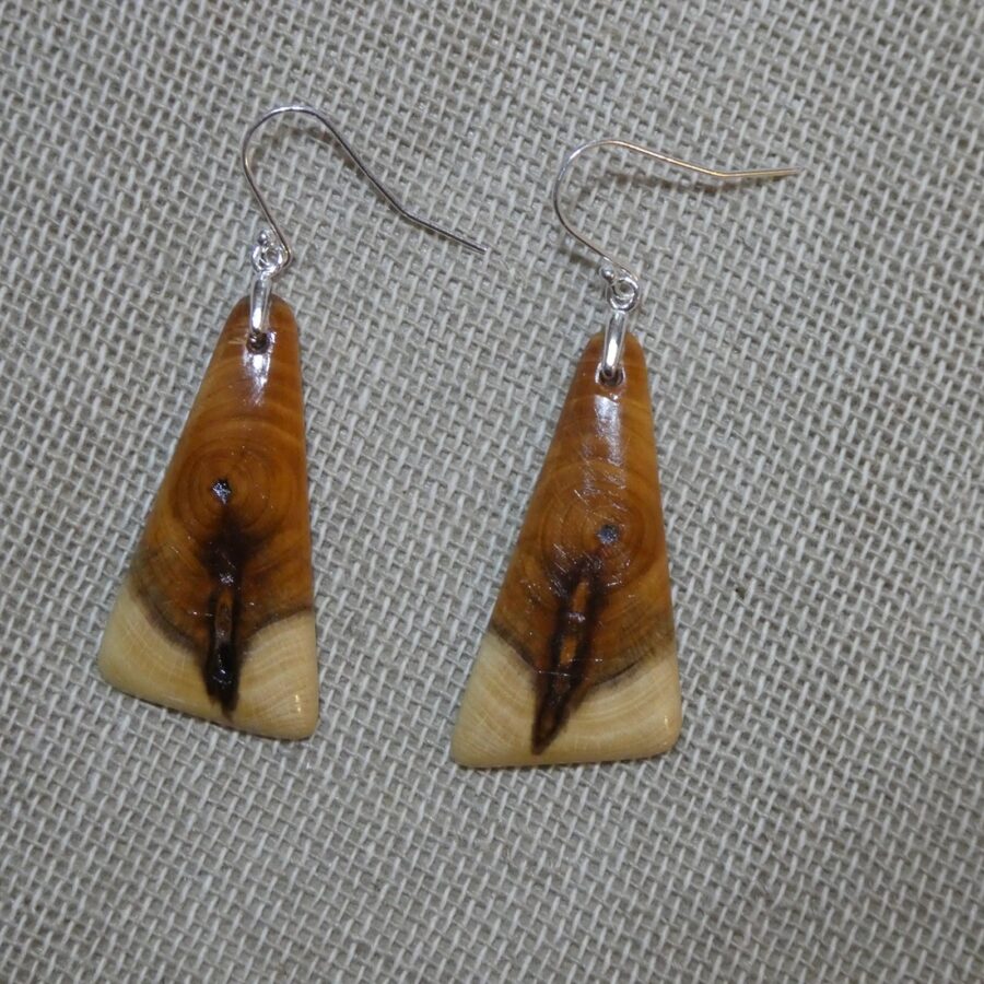 A unique pair of pitted yew wood triangle shaped earrings with sterling silver findings.