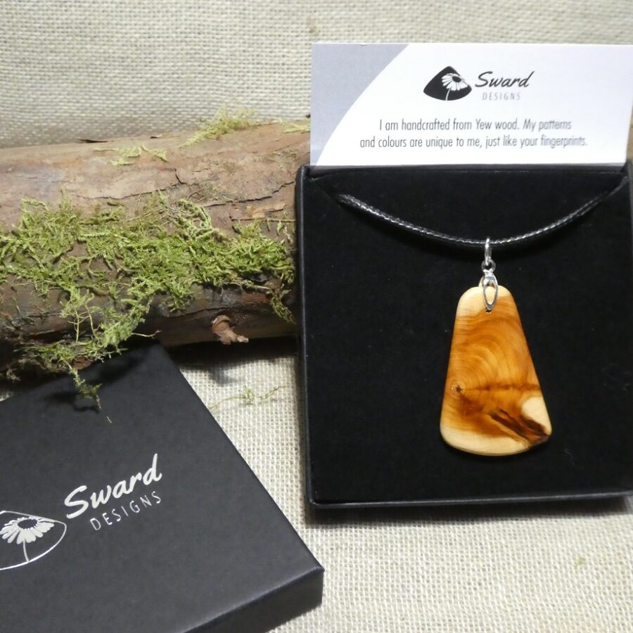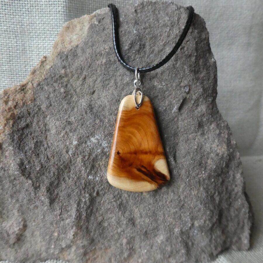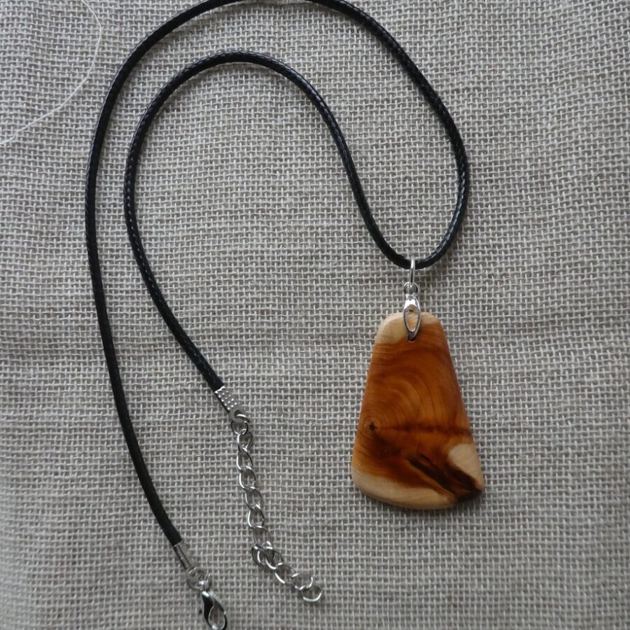 A yew wood drop pendant with sterling silver fixing, on a waxed cotton cord.