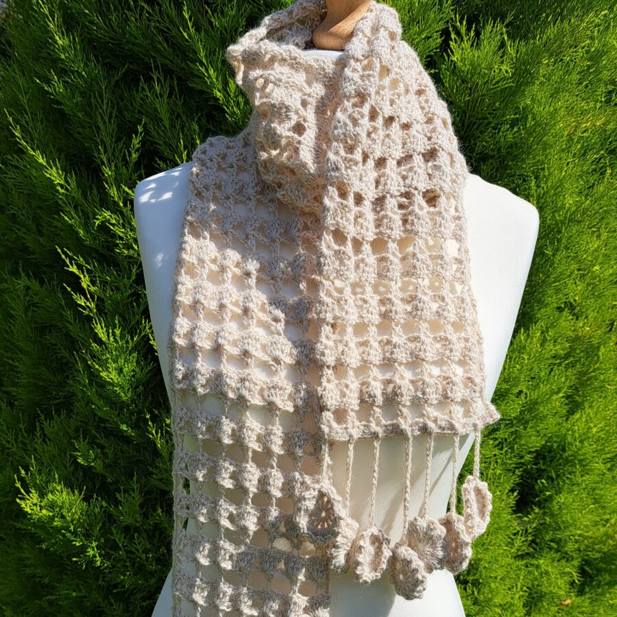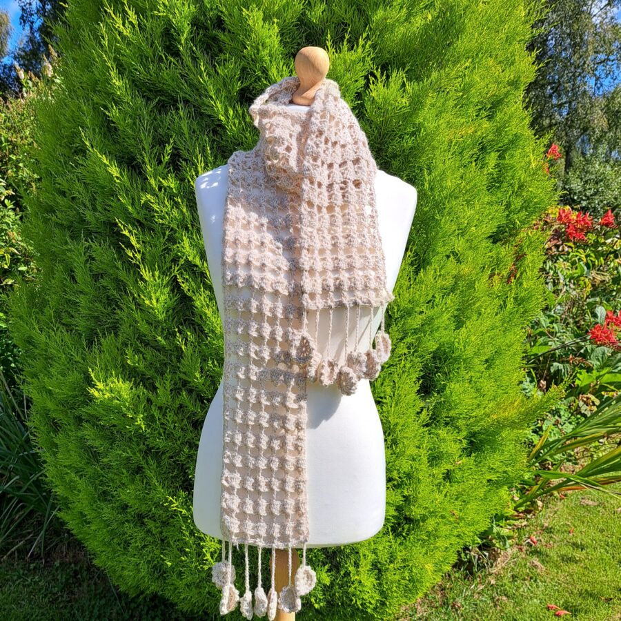 Knitted and crocheted in pale ivory/cream undyed 100 % baby Alpaca yarn from a UK herd.