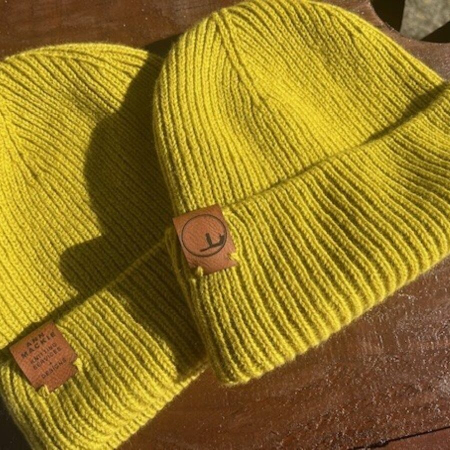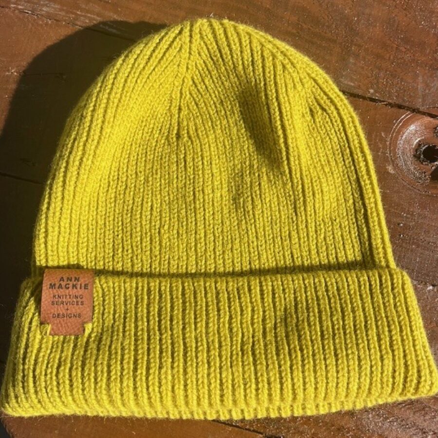 A beautiful android ribbed beanie hat made in 100% merino lambswool, with a leather label. Made in Orkney.