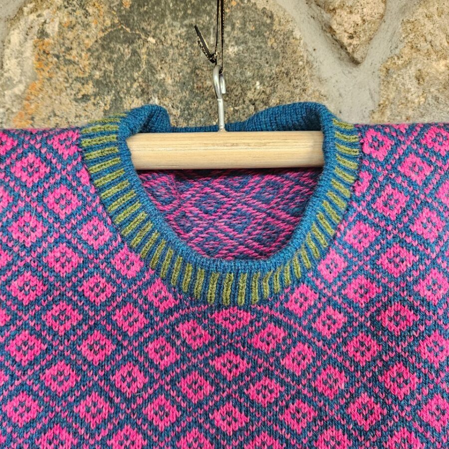 A new design for autumn 2025. This is a boxy style, lambswool jumper which has a neater fit than the unisex jumpers and sits neatly on the hips. It is mainly two-tone, but with a wee pop of colour in the bands and a simple 1x1 pattern on the fold-over cuff and hem. The main colours are reversed on the sleeves, which have a smaller geometric pattern. As each item is individually made on a vintage hand-frame knitting machine, colours may vary slightly but the overall effect is similar. Colourway: Atlantic/Carnation