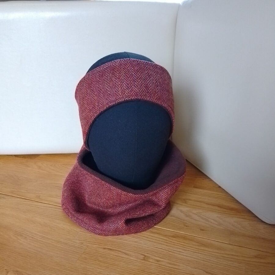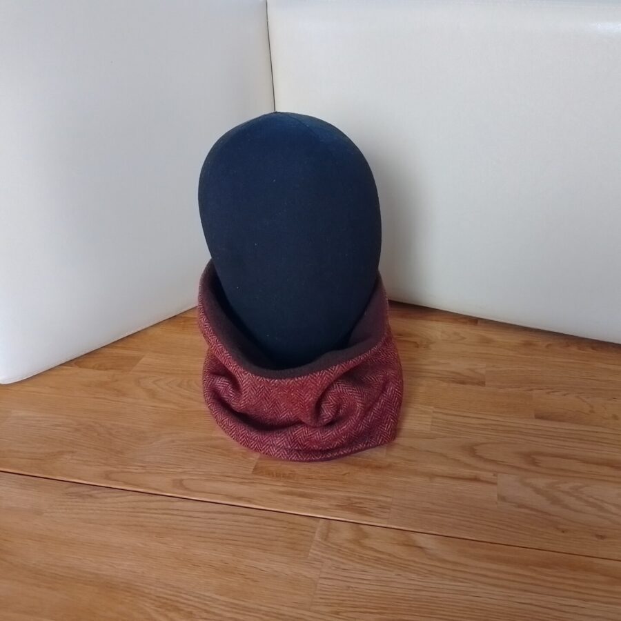 A stylish autumn herringbone tweed cowl with brown fleece lining.