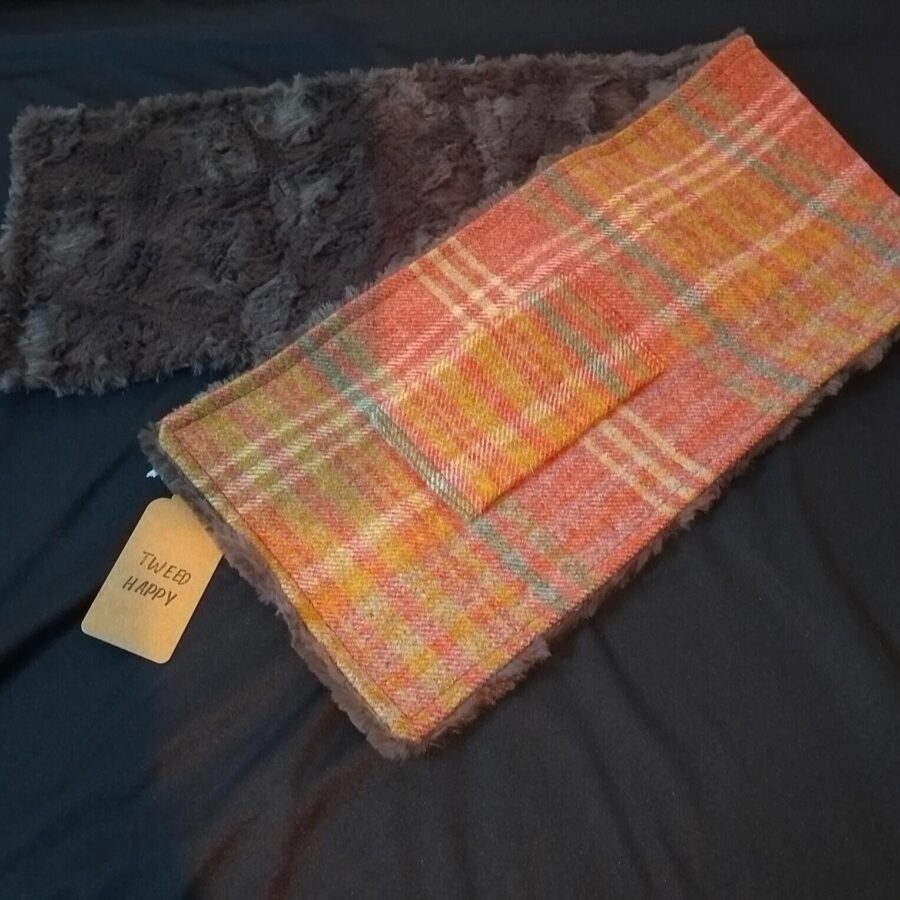 A stylish autumn coloured tweed scarf with faux mink fur lining.