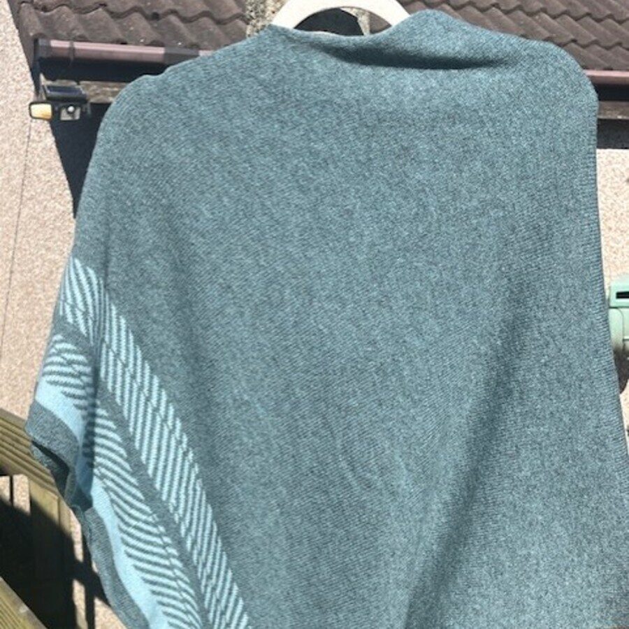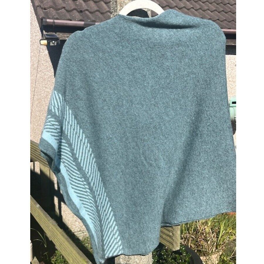 A beautiful ayre-caspian and raindrop poncho machine knitted in 100% merino lambswool. An easy to wear, soft and cosy poncho made in Orkney.