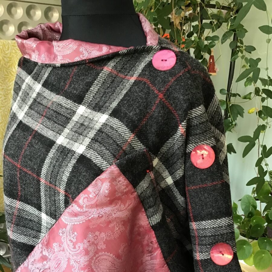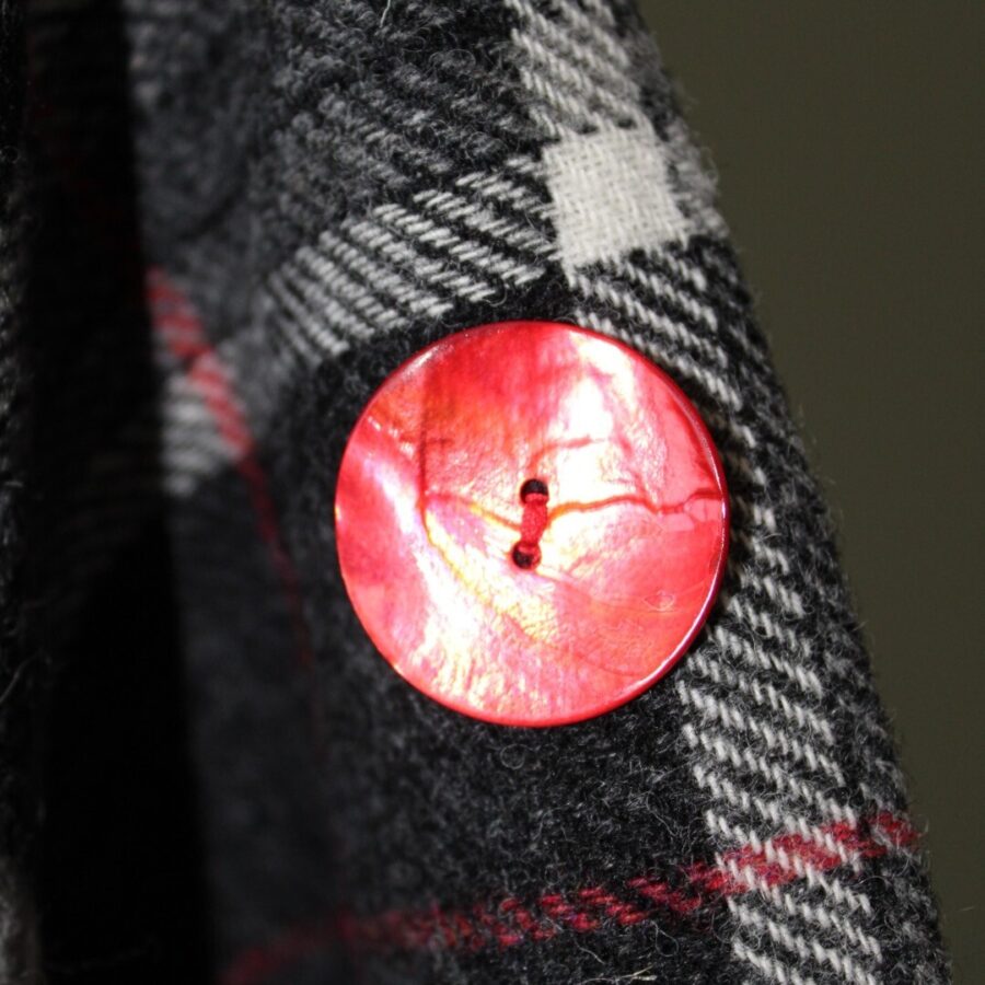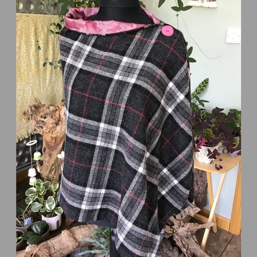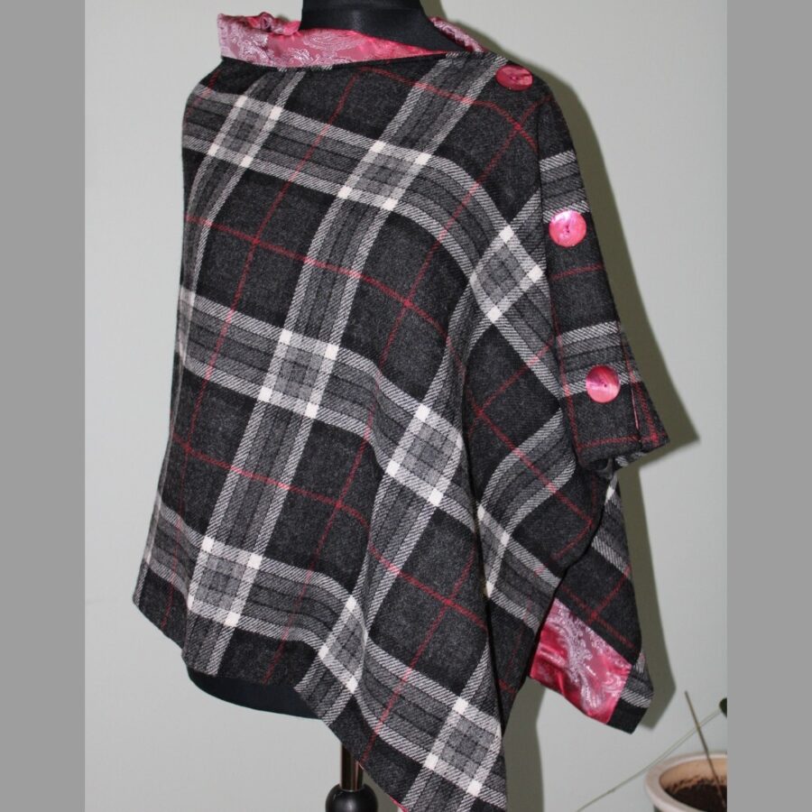 A stunning and versatile fully lined Tweed cape poncho with a rounded neck line, made with the finest black, grey and red check Johnstons of Elgin Tweed and perfect for casual or formal wear. Johnstons of Elgin is one of the leading worldwide providers of cashmere and tweed in fashion – a once well-kept industry secret – who've been operating for 225 years. It is beautifully paired with a soft red lining and contrasting red shell buttons.