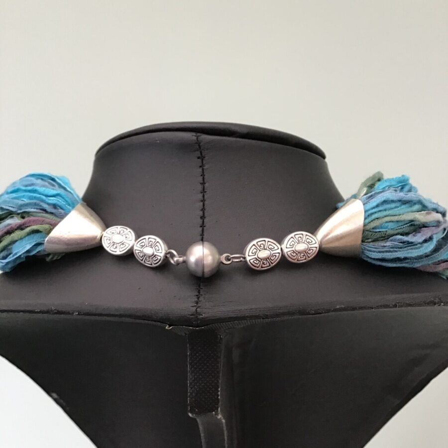 Twisted Scarves are designed to sit softly just below the neckline. Twist by holding the bead caps at the ribbon ends to create the desired length and shape. Open the magnet by holding adjacent beads and gently pull. The magnetic clasps are nickel free. Ideal to wear to compliment any outfit or to match your shoes or handbag etc to complete your desired look. Easy to wear and so suitable for anyone who struggles to fasten necklaces etc due to arthritis or other medical conditions.