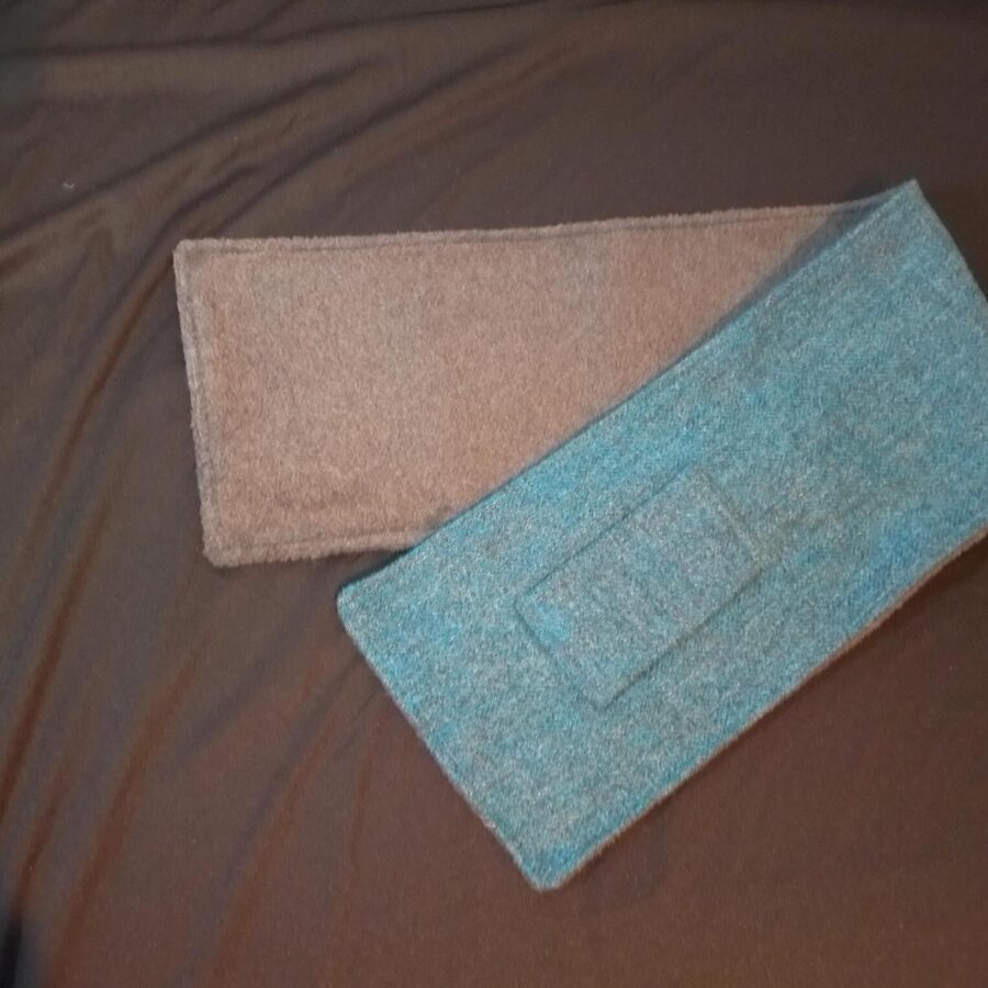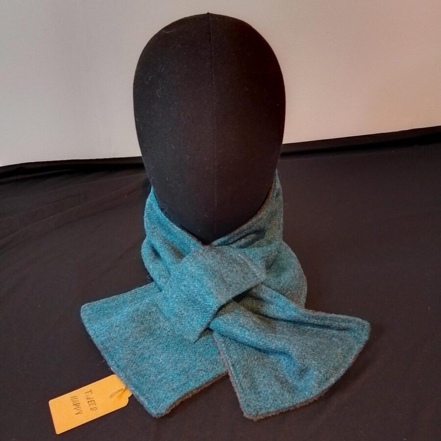 A stylish blue herringbone tweed scarf with dark grey fleece lining.