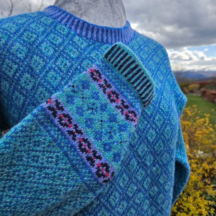 This is a boxy style, lambswool jumper which has a neater fit than the unisex jumpers and sits neatly on the hips. It is mainly two-tone, but with a wee pop of colour in the bands and a simple 1x1 pattern on the fold-over cuff and hem. The main colours are reversed on the sleeves, which have a smaller geometric pattern. As each item is individually made on a vintage hand-frame knitting machine, colours may vary slightly but the overall effect is similar.