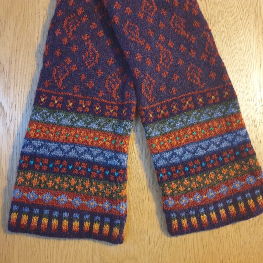 There is a wee touch of cashmere luxury, complimenting the beautiful Shetland wool colours, in this long, skinny scarf. The main colour of blueberry is a cashmere/lambswool blend with a 'Paisley' contrast pattern and the colourful 'Peerie' design at the end is in Shetland wool.