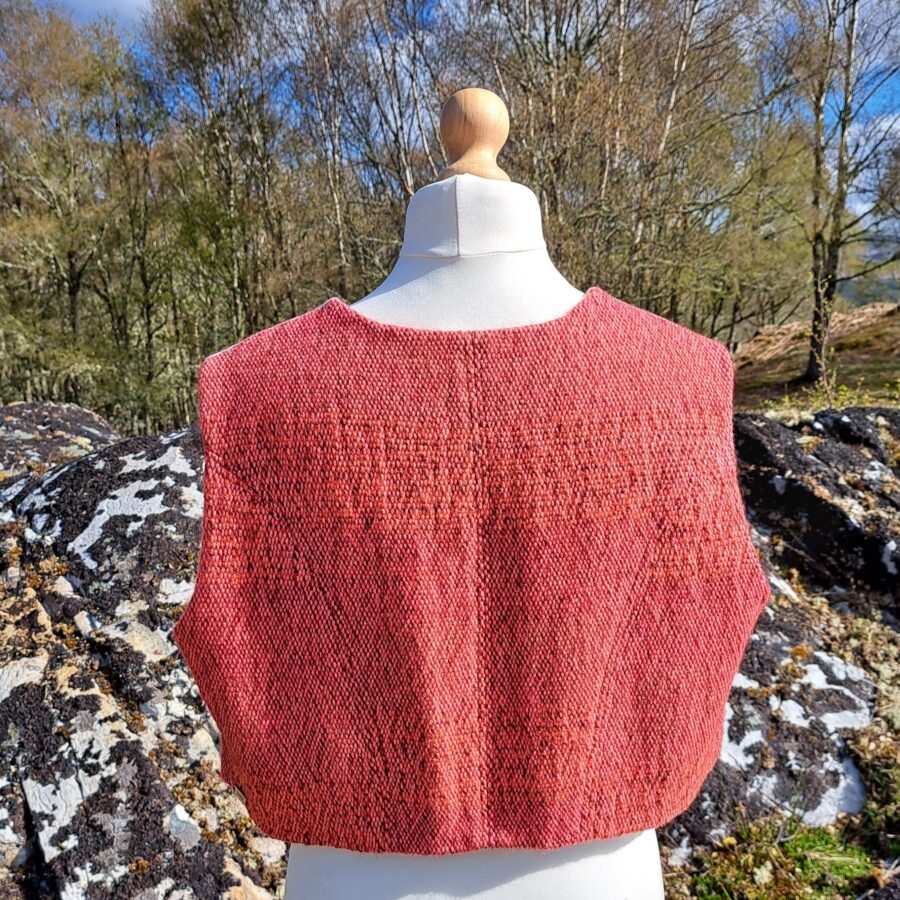 A unique piece of wearable art with a practical application. This waistcoat was cut to a pattern drafted by the maker to showcase the fabrics from which it is crafted. The main fabric was created on a rigid heddle loom from 100% cotton coral pink warp, and 100% wool weft yarns in red, burgundy, and brown.
