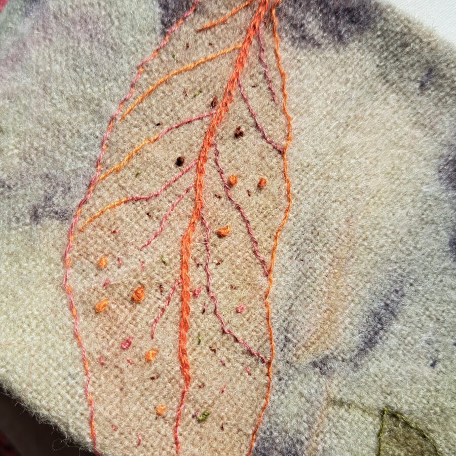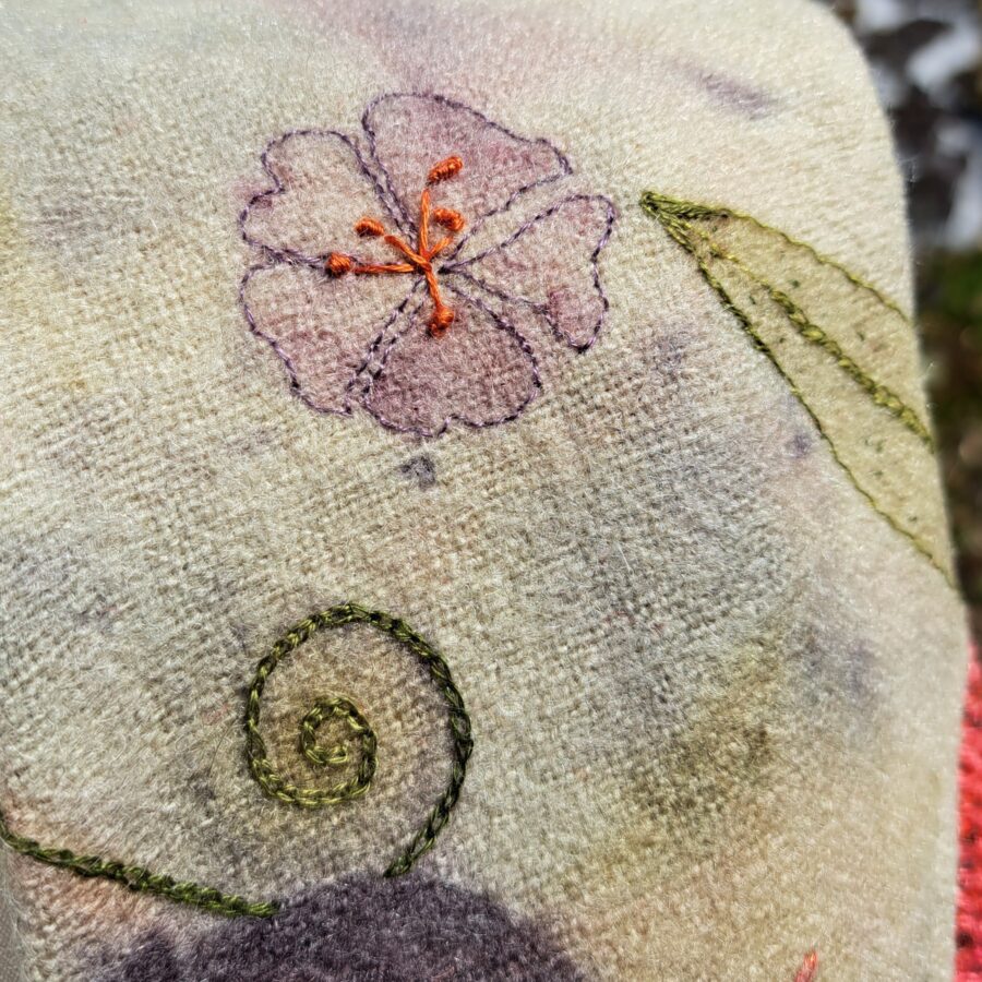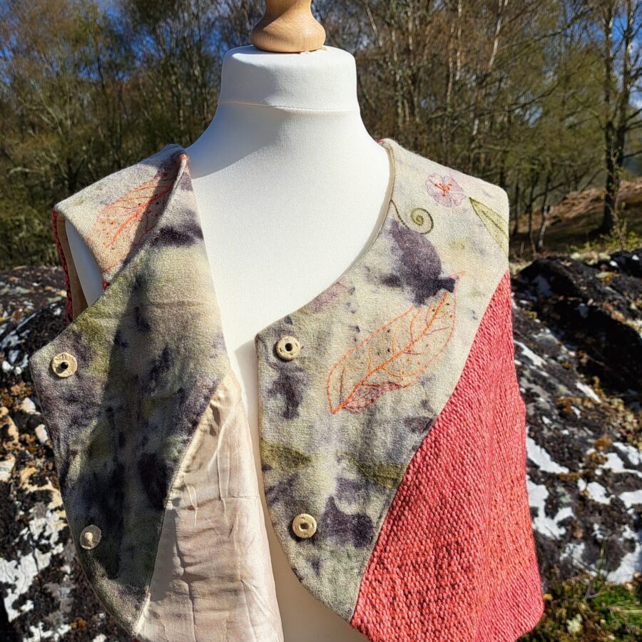 This garment is fastened with two concealed pop/snap fasteners and is designed to be worn loose over a blouse or jumper depending on the season. The front panels of up cycled wool blanket, feature a botanical eco printed design with embroidery. The botanicals were all grown in the maker's garden. The hand stitched lining is constructed from vintage silk which has been eco dyed to a complimentary colour.