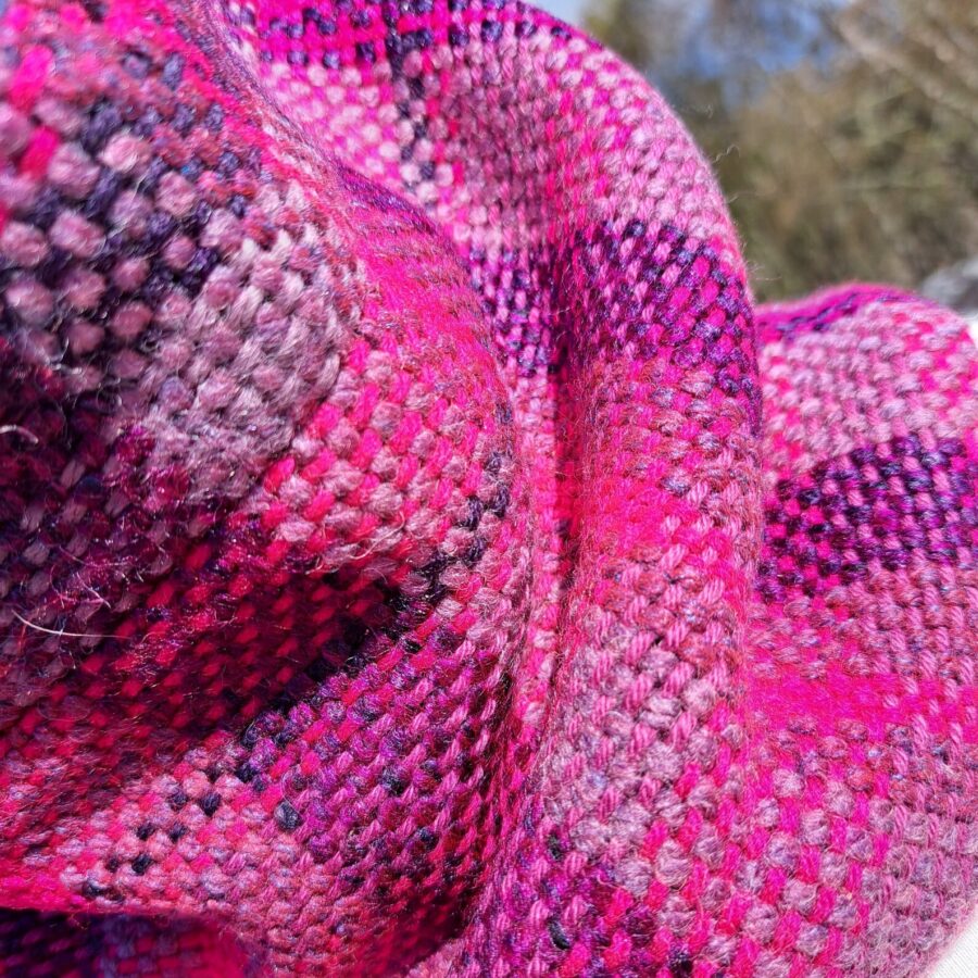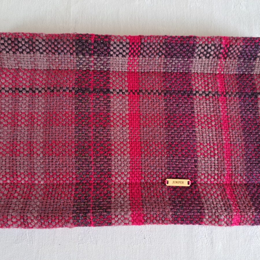 Woven from mixed yarns including acrylic, alpaca, cotton, sparkle, and wool, on a rigid heddle loom, this unique accessory has a manmade polar fleece navy lining for comfort.