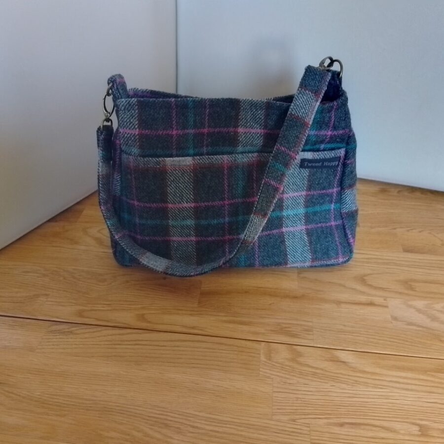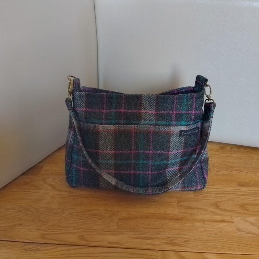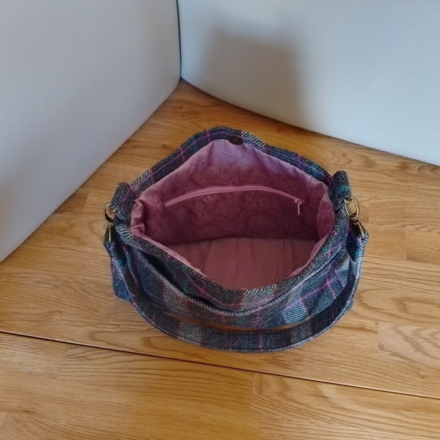 A lovely checked tweed bag with silky pink lining, internal zip pocket, magnetic clasp.