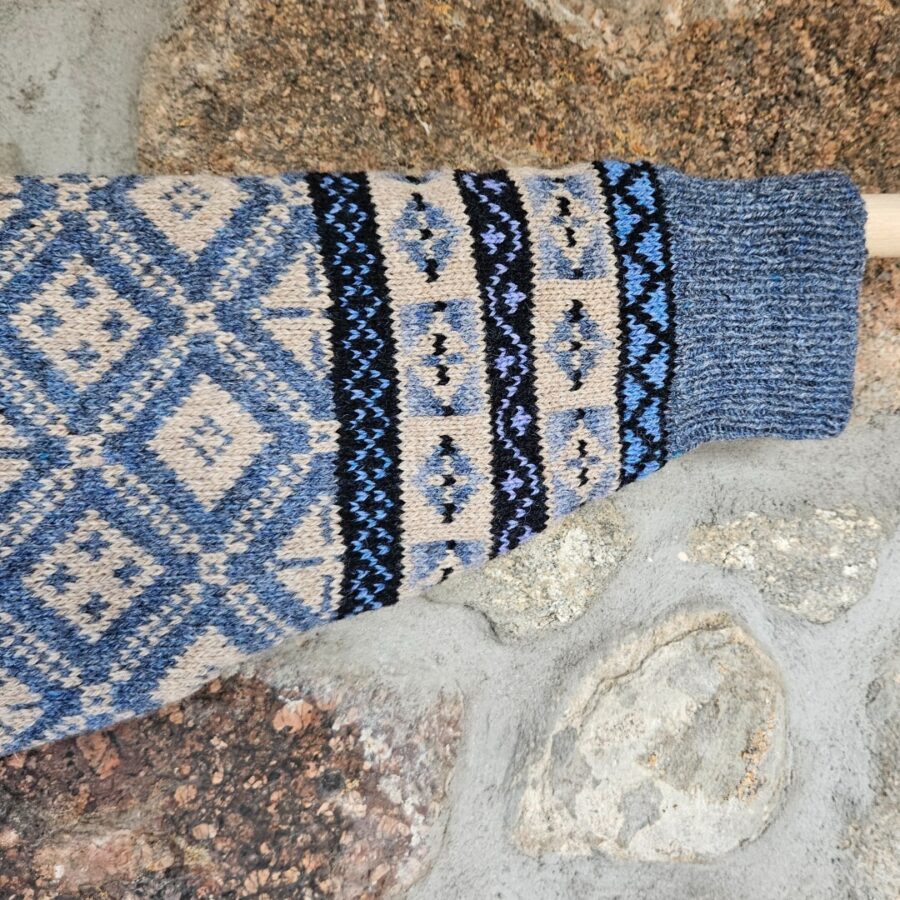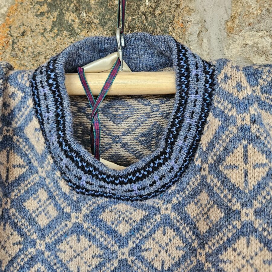 Wool is very breathable, which means less frequent washing. However, when it does need to be washed, it should be hand washed in tepid water, given a quick spin or rolled in a towel to remove excess water, and dried flat. It can be pressed with a damp cloth and gently reshaped, if necessary. Given this wee bit of care, you will be able to enjoy wearing your Whinnyfold Knitwear clothing for years to come. Colourway: Clipper/Oatmilk. The main colour is a mid-blue with a natural beige contrast. The border has beige and shades of blue. This design can also be knitted up as a longer length 72cm (please specify LONG on the order)