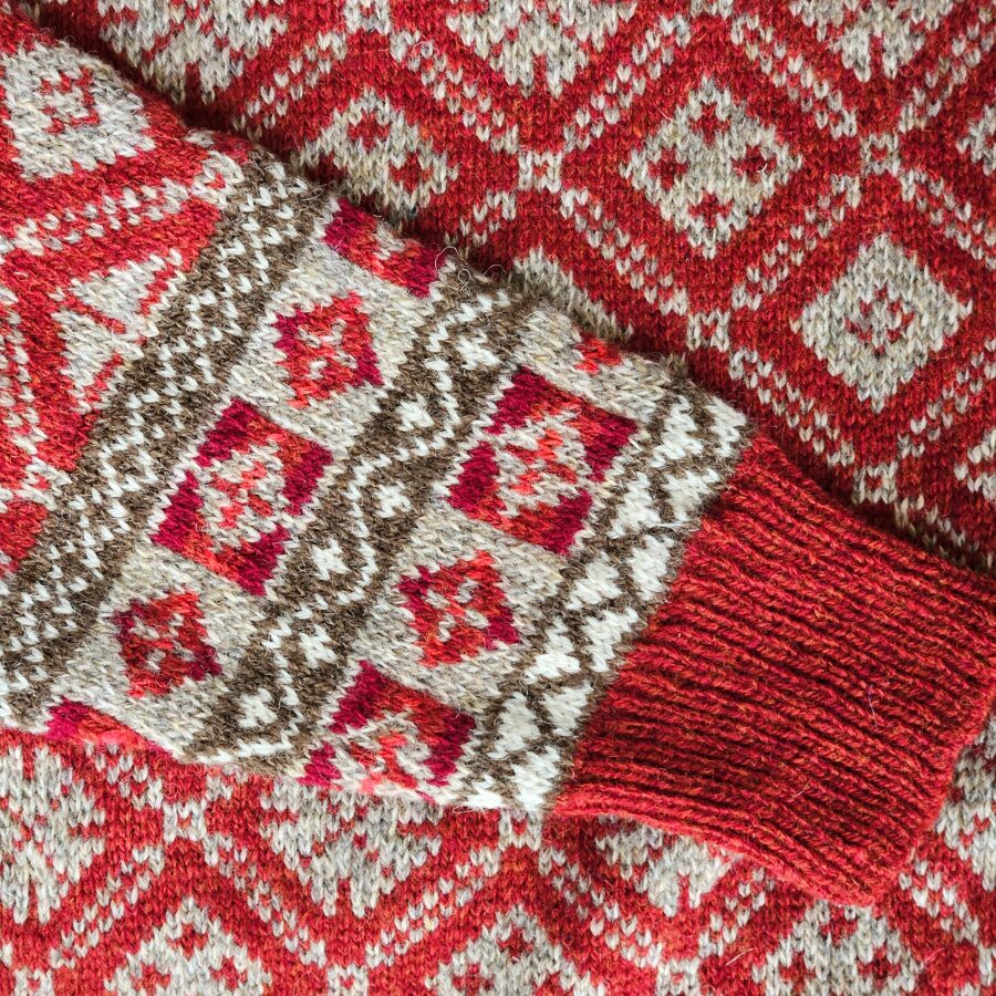 Corrachree is a hill, central to the Howe of Cromar, and a beautiful mansion house. This design has drawn on a variety of traditional, diamond-shaped patterns, all within an overall lattice design. The borders again use traditional, geometric patterns in subtle shades. This unisex jumper has been knitted in a standard length, but is also available to order in a longer length (73cm £115) making it very suitable for men who would like an original jumper that’s a wee bit different from mainstream woollies. However, it is available to order to suit your requirements. It is knitted in lambswool which gives warmth and durability. Colourway: Blaze/Mushroom - a deep rusty red with a flecked beige contrast.