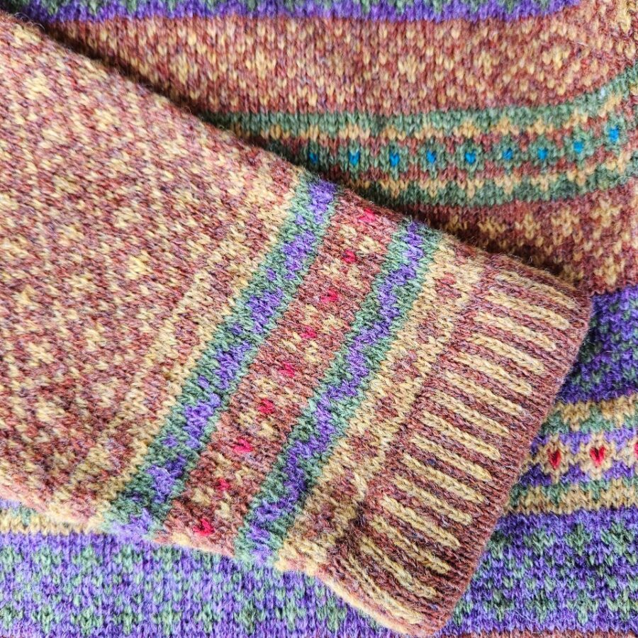 This little jumper is a casual, boxy shape, perfect for wearing on its own or layering under a jacket. It’s not too long (55cm approx.) and sits neatly on the hips. It is knitted in a mixture of lambswool and Shetland wool and offers a softness and warmth in a variety of beautiful colours. The body comprises traditional patterns in four colours and similar patterns are used to form a cuff on the sleeve, which has a lattice pattern in two colours. As each item is individually made on a vintage hand-frame knitting machine, colours and patterns may vary slightly but the overall effect is similar. Colourway: Sienna/Cumin- the main colour is a warm autumnal brown with an old gold, olive green and heather contrast.