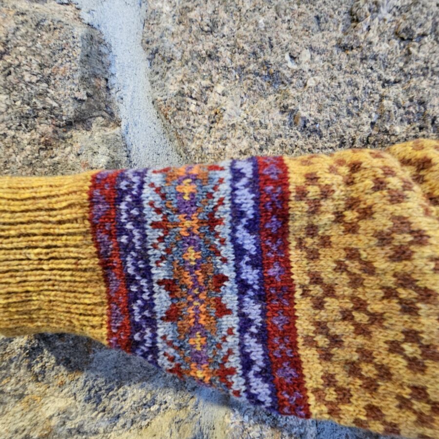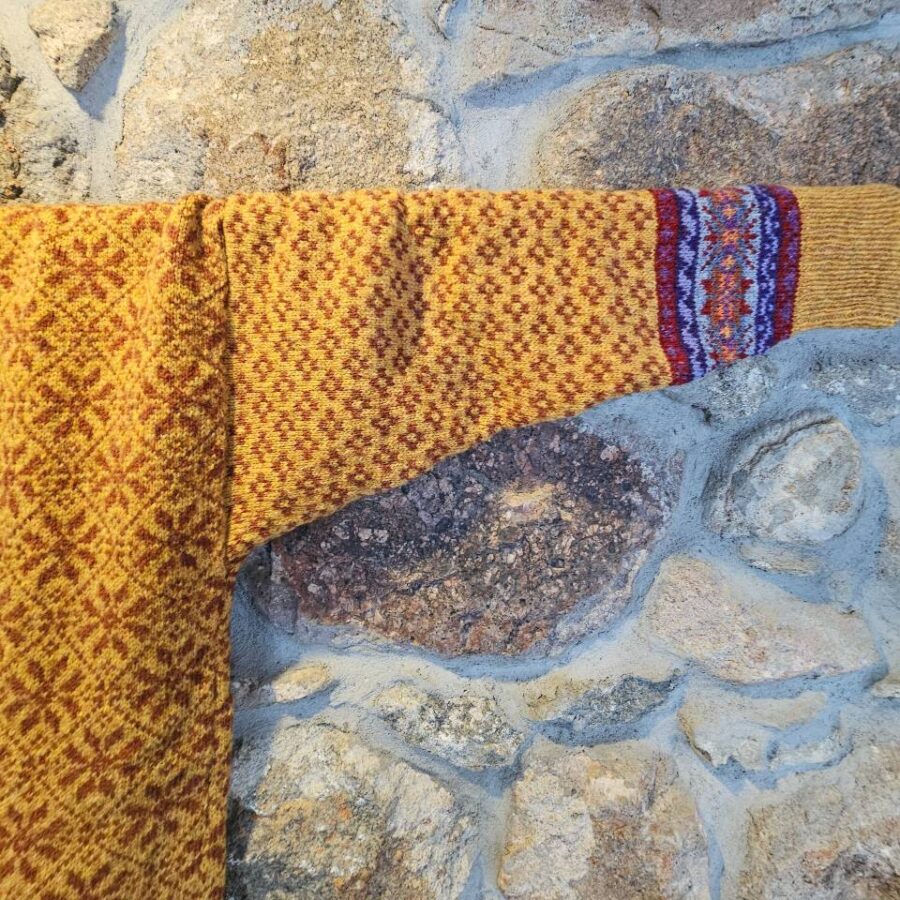 This design is based on traditional Fair Isle patterns and is named after the ancient stone circle near Tarland. The Tomnaverie jumper has a main pattern of a stylised star, with a contrasting border detail. The sleeves have the same border but feature a smaller main pattern. This jumper has ribbed cuffs and welt and is suitable for men and women. As each item is individually made on a vintage hand-frame knitting machine, colours and sizes may vary slightly but the overall effect is similar. Colourway: Cumin/Sienna. The main colour is a old gold with mid-brown contrast. The border is autumnal shades with blue and purple. In stock: Large (Standard length). This unisex jumper has been knitted in a slightly longer length (73cm) than standard, making it very suitable for men who would like an original jumper that’s a wee bit different from mainstream woollies. However, it is also available to order to suit your requirements.