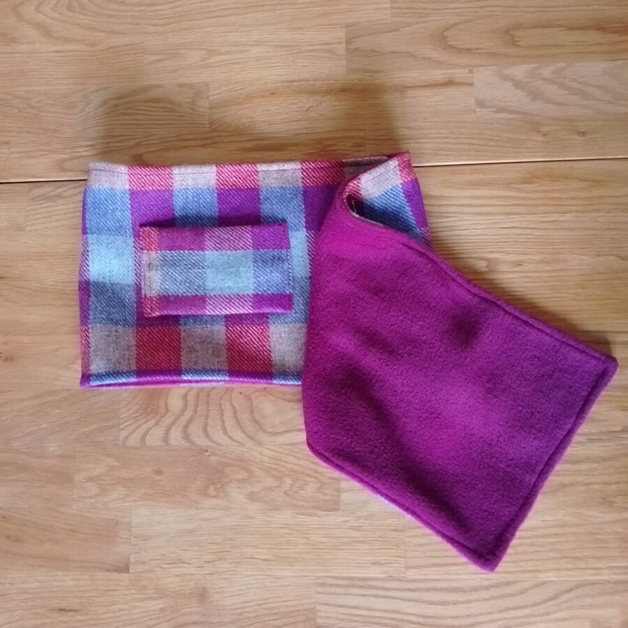 A stylish dahlia pink block tweed neck warmer with plum fleece lining.