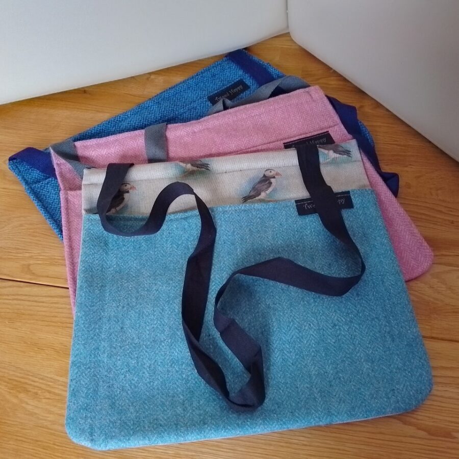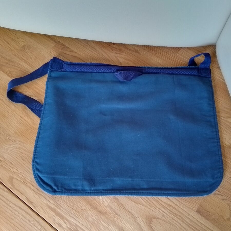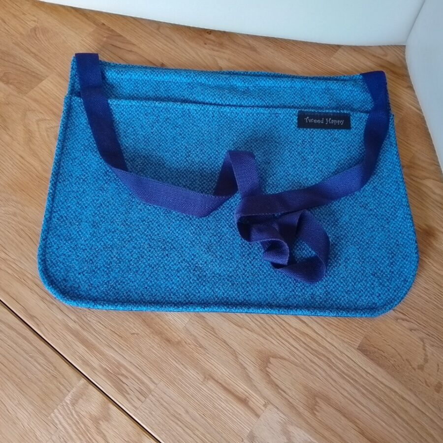 A dark blue tweed peg bag with navy cotton back.