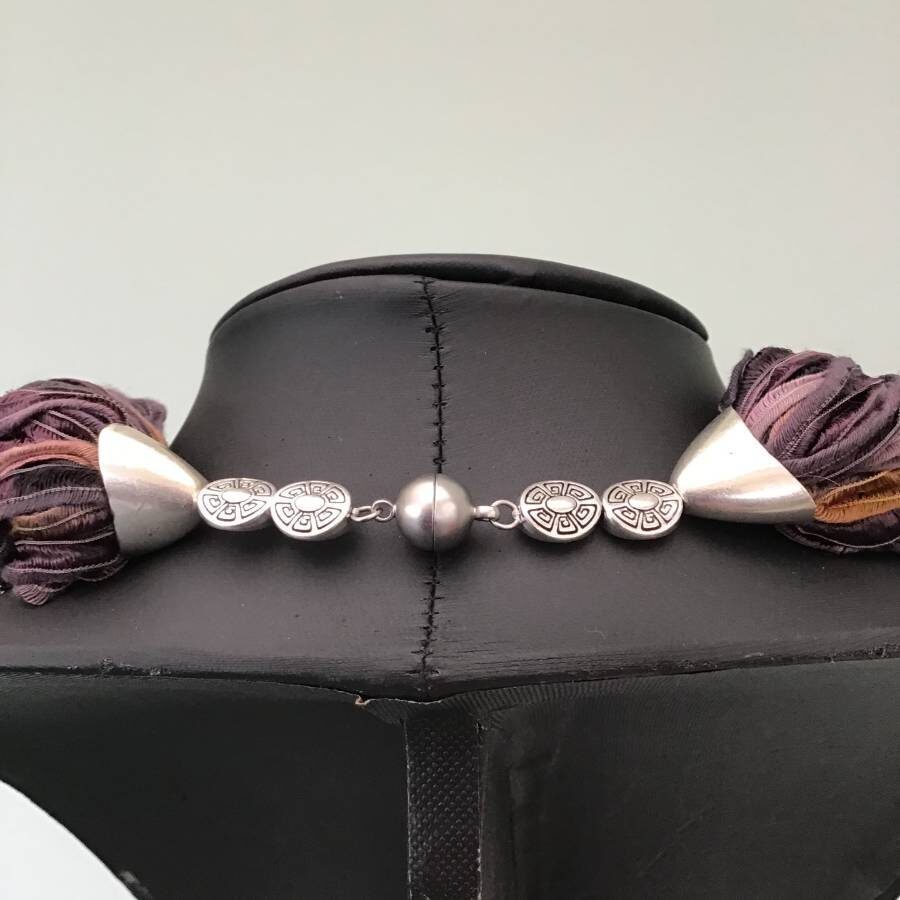 Twisted Scarves are designed to sit softly just below the neckline. Twist by holding the bead caps at the ribbon ends to create the desired length and shape. Open the magnet by holding adjacent beads and gently pull. The magnetic clasps are nickel free. Ideal to wear to compliment any outfit or to match your shoes or handbag etc to complete your desired look. Easy to wear and so suitable for anyone who struggles to fasten necklaces etc due to arthritis or other medical conditions.