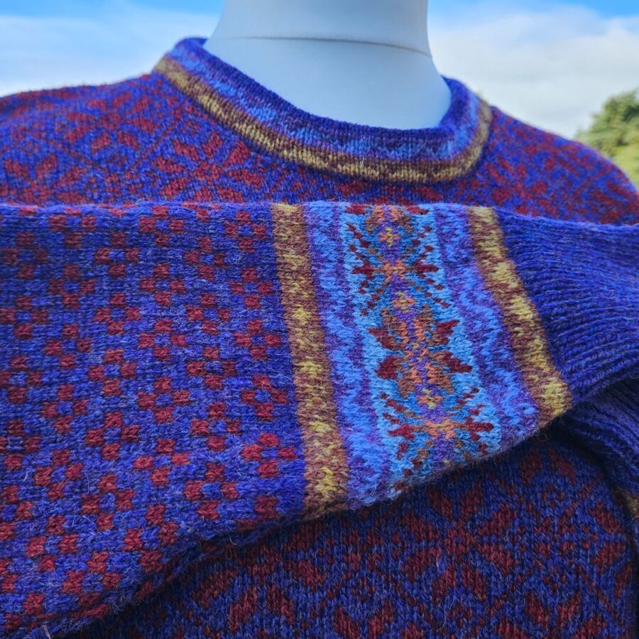 The Tomnaverie jumper has a main pattern of a stylised star, with a contrasting border detail. The sleeves have the same border but feature a smaller main pattern. This jumper has ribbed cuffs and welt and is suitable for men and women. As each item is individually made on a vintage hand-frame knitting machine, colours and sizes may vary slightly but the overall effect is similar. Colourway: Dark Violet/Blaze. The main colour is a dark purple with a burnt-red contrast. The border is autumnal shades with blue and purple peerie patterns.