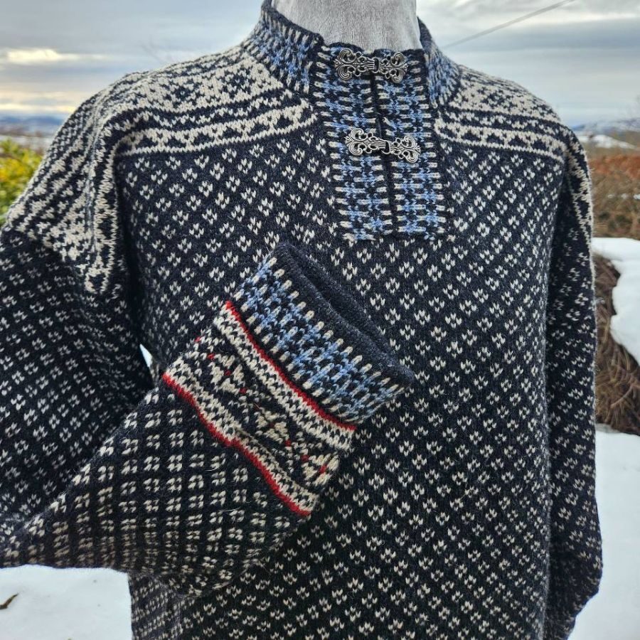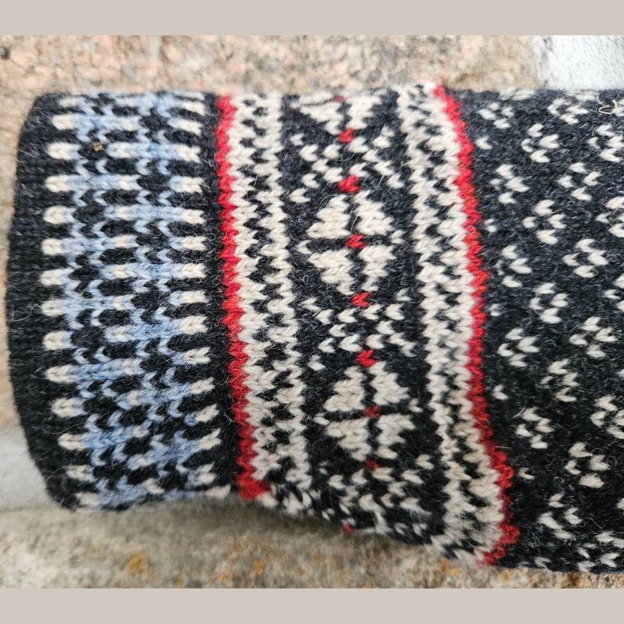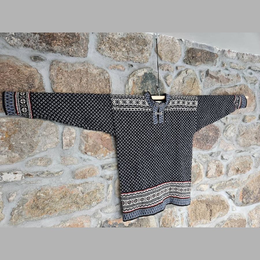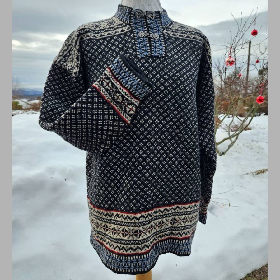 The Davoch jumper is a tunic style with Fair Isle designs and a Scandi twist. It is approx. 68cm in length and an easy to wear fit. Knitted in 4-ply supersoft lambswool, it is lighter than traditional Norwegian jumpers but still super-cosy. Colourway is charcoal/oatmilk with blaze and blues: a dark grey with a natural soft beige, a hint of rusty red and shades of blue in the band. As each item is individually made on a vintage hand-frame knitting machine, colours and patterns may vary slightly but the overall effect is similar.