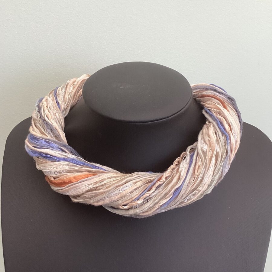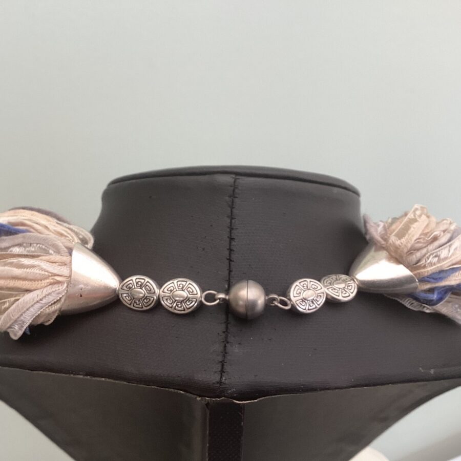 Twisted Scarves are designed to sit softly just below the neckline. Twist by holding the bead caps at the ribbon ends to create the desired length and shape. Open the magnet by holding adjacent beads and gently pull. The magnetic clasps are nickel free. Ideal to wear to compliment any outfit or to match your shoes or handbag etc to complete your desired look. Easy to wear and so suitable for anyone who struggles to fasten necklaces etc due to arthritis or other medical conditions.