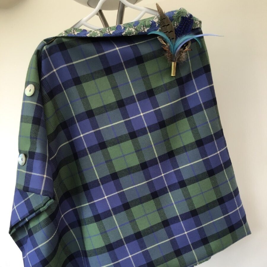 A stunning and versatile fully lined Tweed cape poncho with a rounded neck line, made with the finest green and blue check Johnstons of Elgin Tweed and perfect for casual or formal wear. Johnstons of Elgin is one of the leading worldwide providers of cashmere and tweed in fashion – a once well-kept industry secret – who've been operating for 225 years. It is beautifully paired with William Morris cotton lining and contrasting pearlescent shell buttons. (feather brooch is not included)