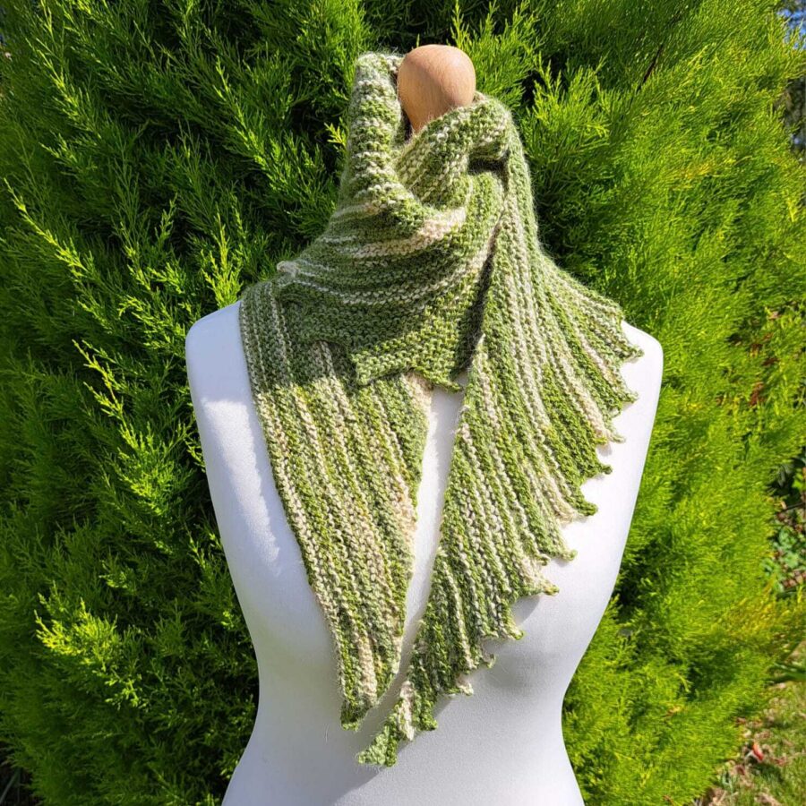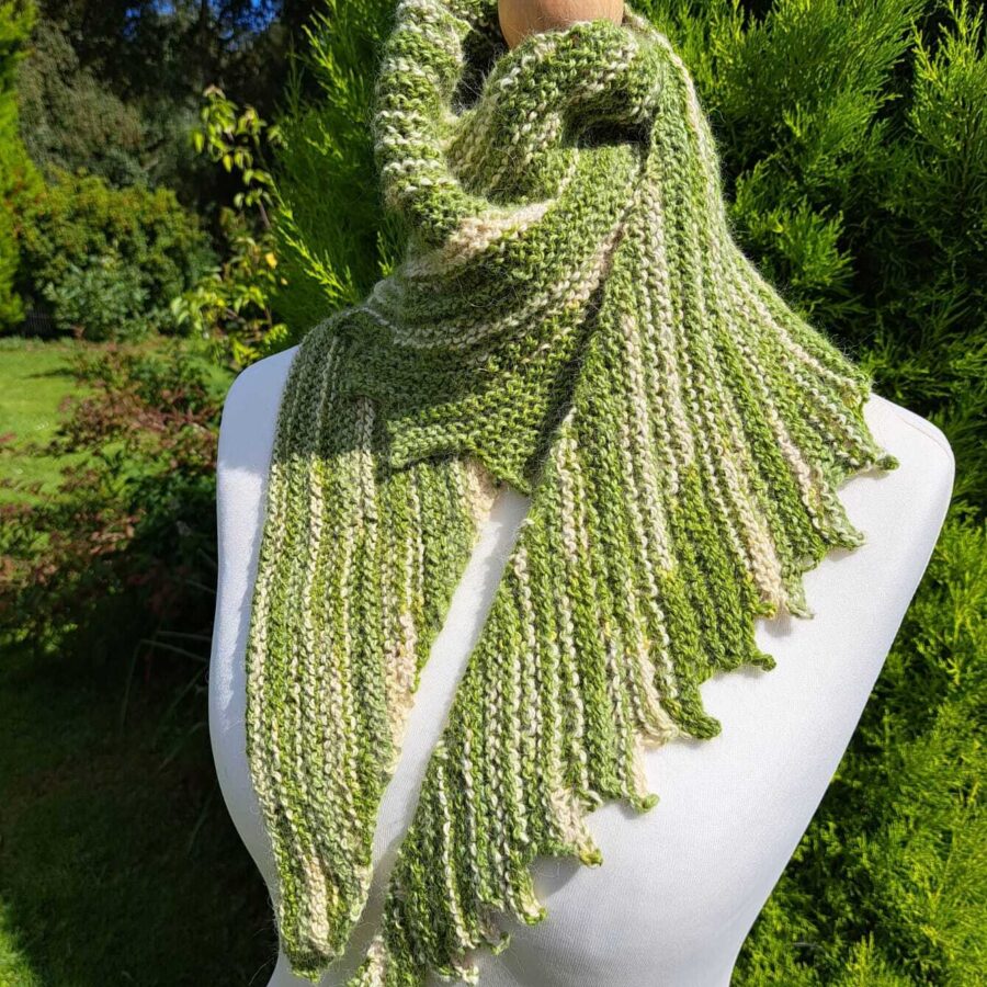 Knitted in pale lime green and ivory/cream using variegated 50% Alpaca / 50% acrylic yarn.