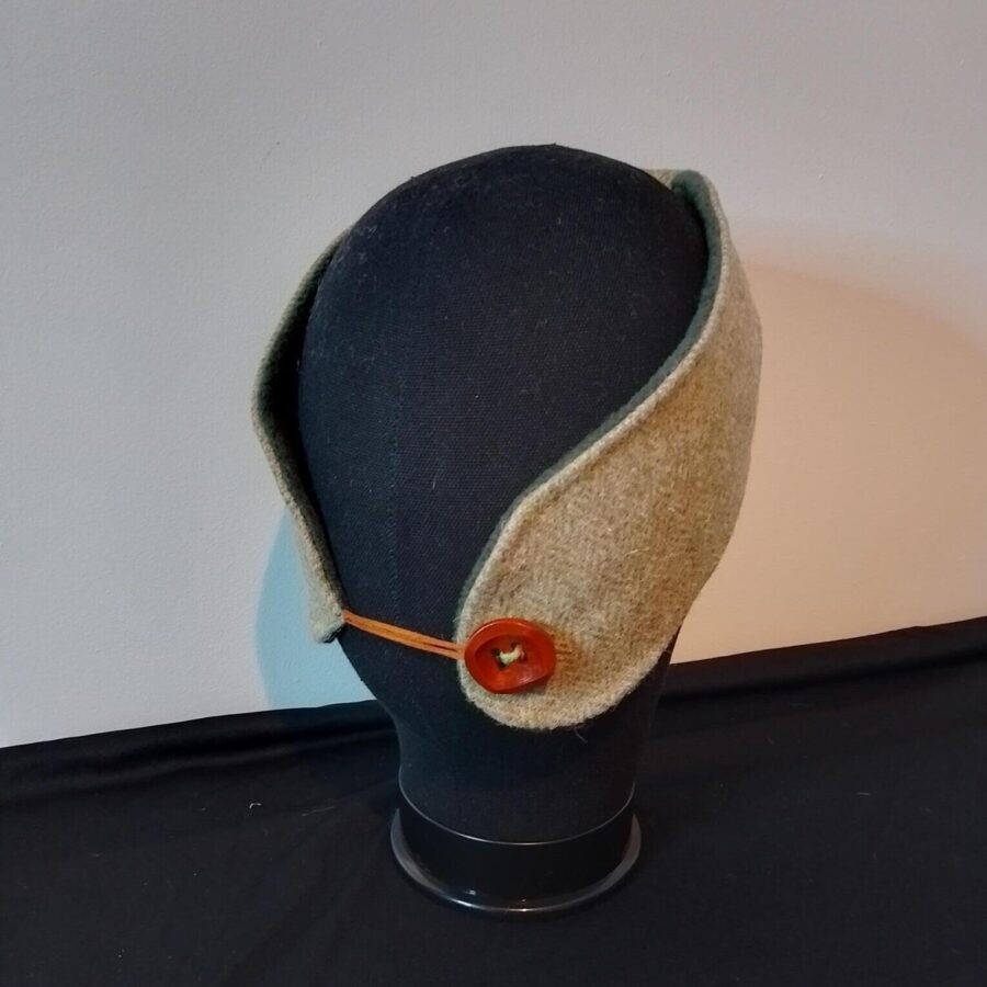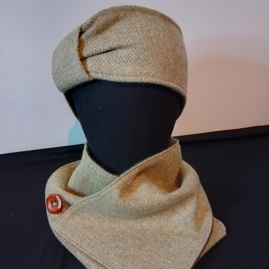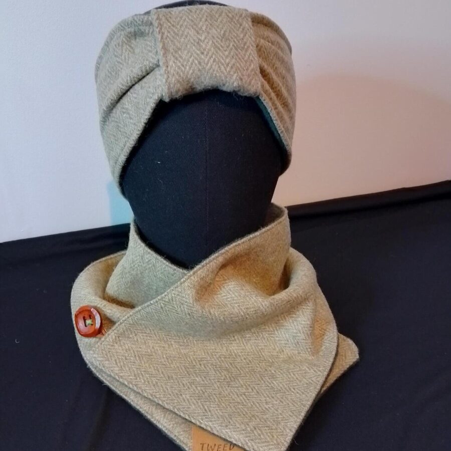 A stylish green herringbone tweed headband with adjustable bow and green fleece lining with elastic at the back. It has a wooden button and leather fastener. Matching scarf also available.