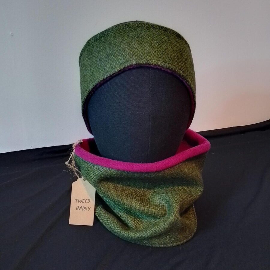 A stylish green herringbone tweed headband with plum fleece lining with elastic at the back. Matching cowl also available.