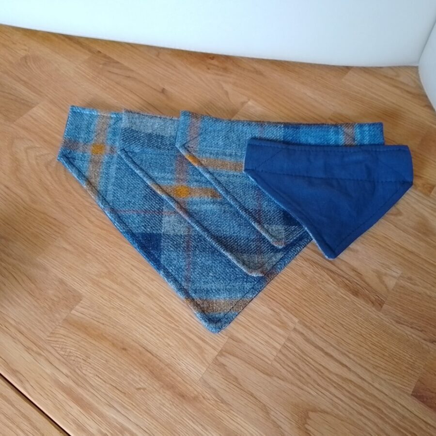 Gorgeous dog bandana made in a grey/blue Shetland Tweed with blue cotton lining. Available in different sizes.