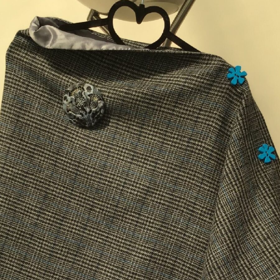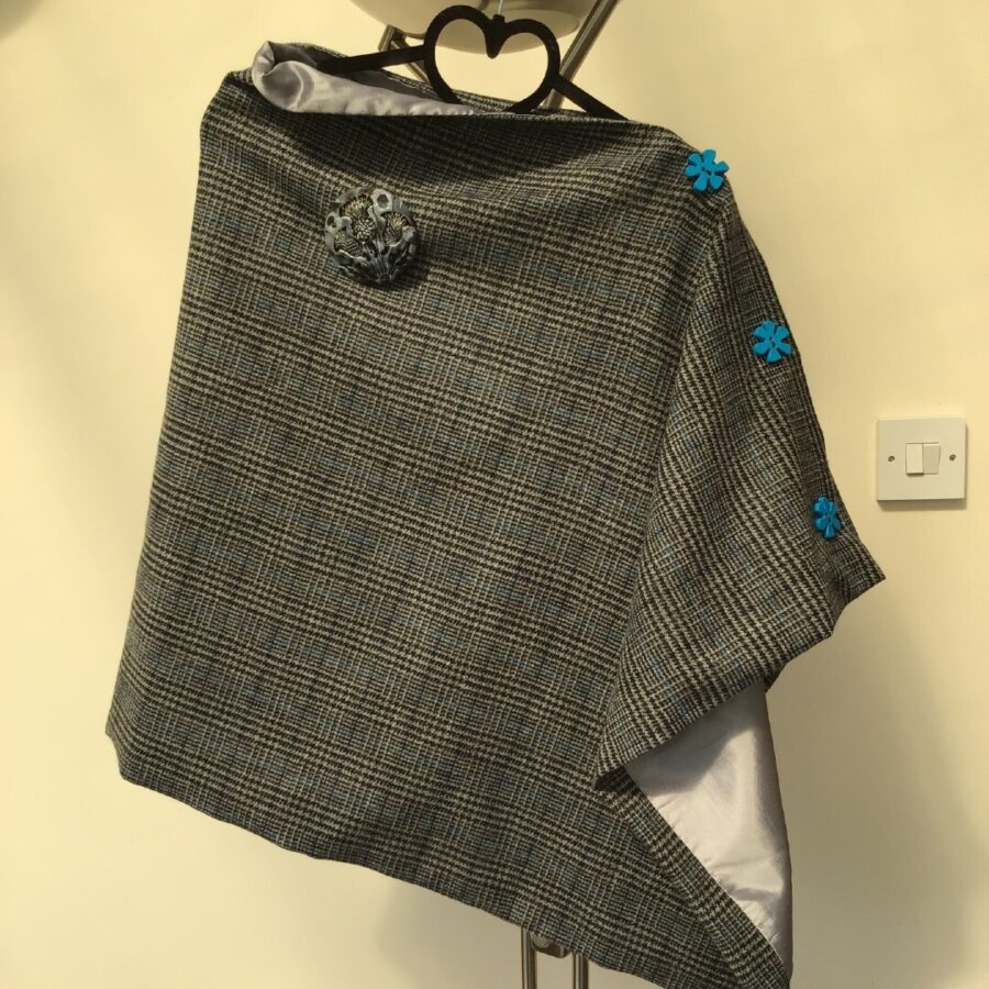 A stunning and versatile fully lined Tweed cape poncho with a rounded neck line, made with the finest grey and blue check Johnstons of Elgin Tweed and perfect for casual or formal wear. Johnstons of Elgin is one of the leading worldwide providers of cashmere and tweed in fashion – a once well-kept industry secret – who've been operating for 225 years. It is beautifully paired with a soft silver grey lining and contrasting blue flower shape buttons. Available either with or without the brooch pictured.